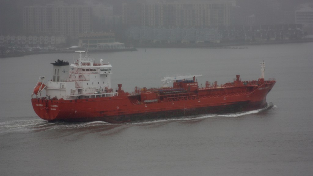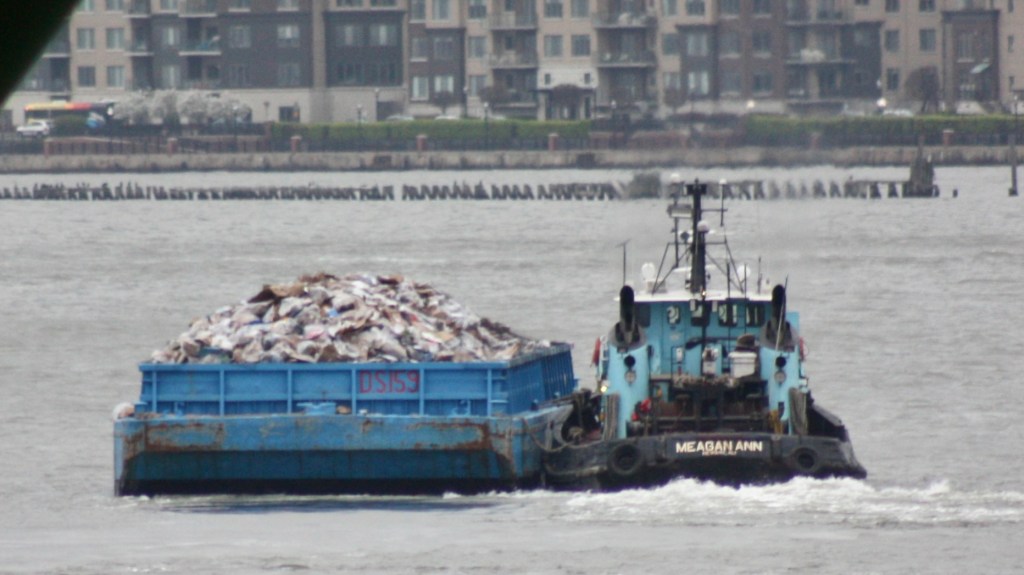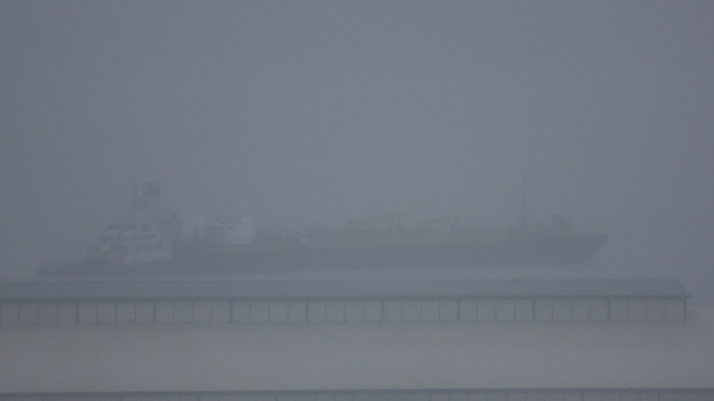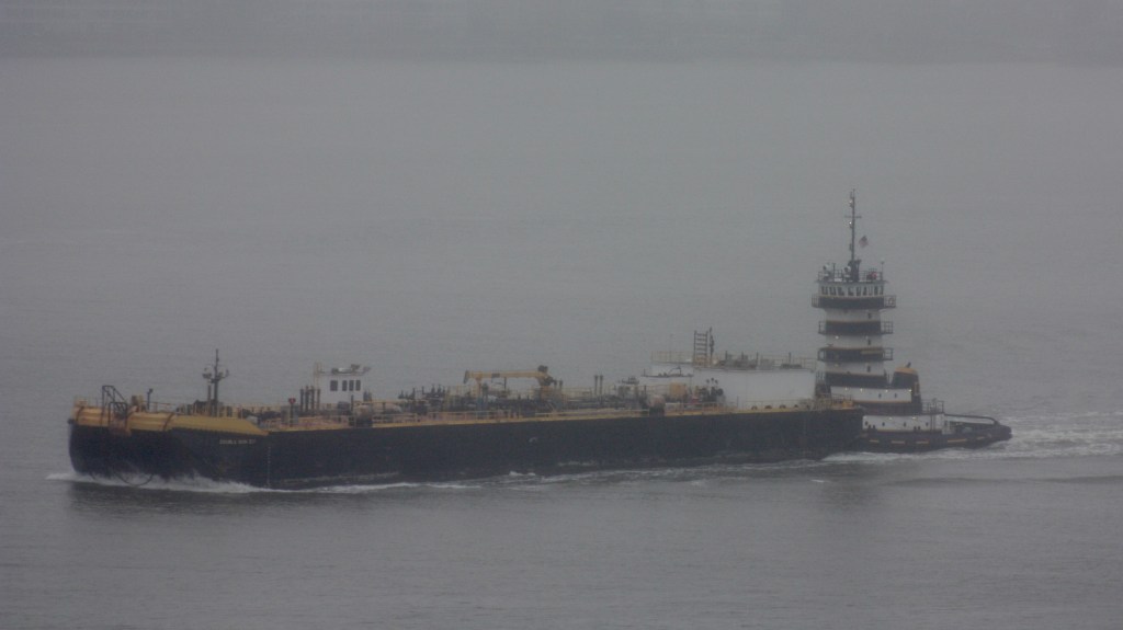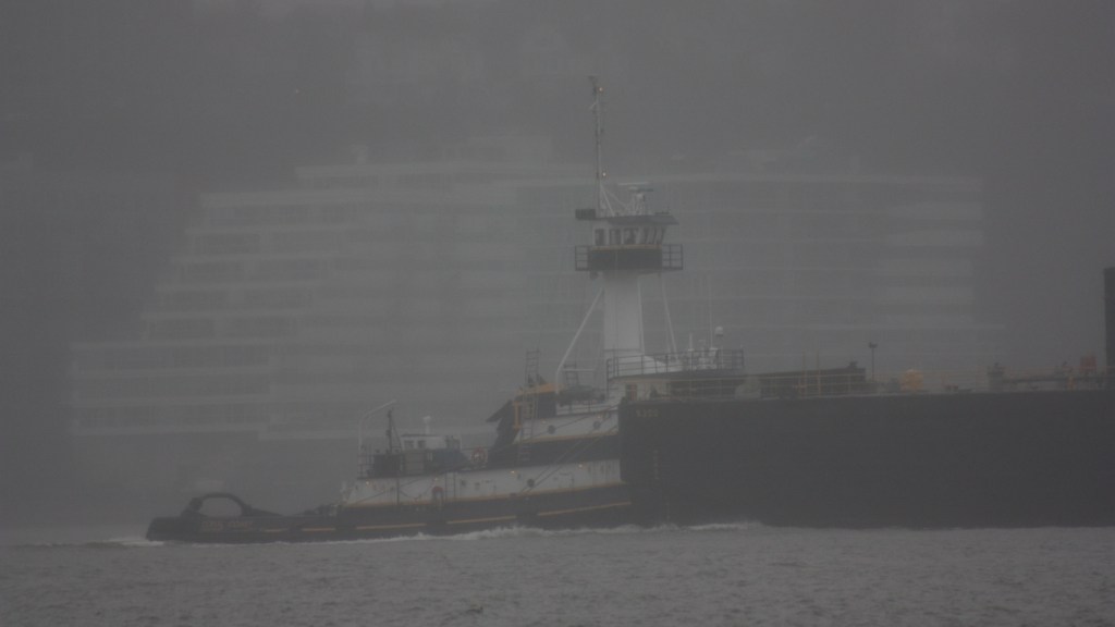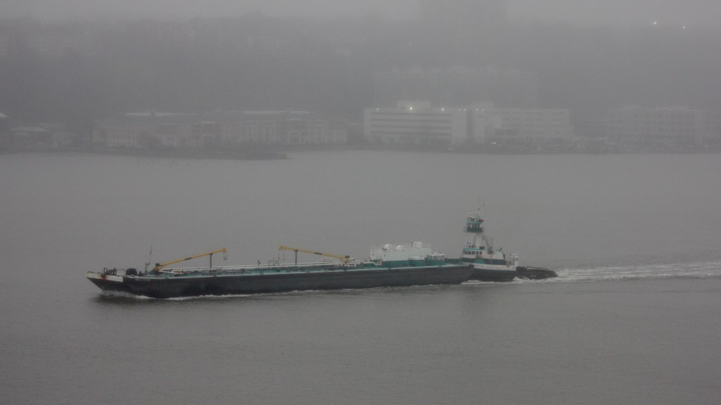 Portuguese flagged tanker Harbour Fashion headed for Albany with a likely cargo of refined petroleum products from the refinery in Montreal Dann’s Sapphire Coast brought a light cement barge back from New Haven, heading for the Lafarge plant in Ravenna, NY.Coral Coast was close behind, pushing a light cement barge of its own from the Lafarge College Point, Queens terminal, also heading back to Ravenna.Janice Ann returned from a run up to Boston and anchored off 72nd Street to await a new cargo. Nicole Reinauer came down in the opposite direction from Newburgh and anchored north of the Janice Ann.Vane’s Charleston returned from a delivery to Port Jefferson and anchored north of Nicole.Discovery Coast with its distinctive ‘wedding cake’ tower came downriver after one their occasional deliveries to New Hamburg, NY and headed for a pier on the Brooklyn waterfront.Marilyn George returned from a delivery to Newburgh just before sundownA pair of Centerline tugs arrived early Wednesday with a bunkering barge for one of the two Norwegian Cruiseline ships which pulled in before sunrise, the Gem and the GetawayA Vane Brothers tug also was on bunkering detail, barely visible in the late morning fog. Both Gem and Getaway were heading back to the Caribbean by late afternoon.DonJon’s Meagan Ann was working DSNY’s Pier 99 transfer station, hauling paper waste to Staten Island for recycling.Buchanan12 was on their usually daily rounds, towing crushed dolomite barges to be exchanged off Jersey CityThese geese chose their next site well, in a fence-protected area above a DEP combined sewer outflow portalCormorants were at their usual posts
