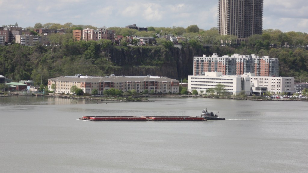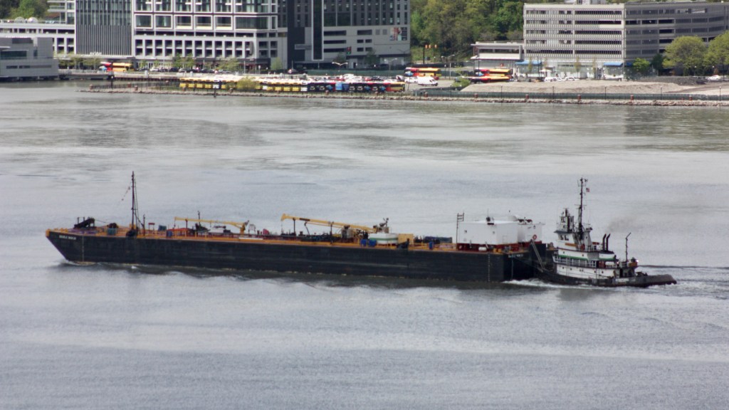 Boston Marine Transportation’s two tugs have been busy on the North River this week. Quenames was hading for Albany with cargo SundayThe evening before, BMT’s other tug, Pinuccia, headed for NewburghPinuccia returned to the Harbor Sunday afternoon with her light barge made up heads-to-tails on the hip.Vane’s Schuylkill returned from Albany with a light barge of its own Sunday and headed straight for Tremley Point on the Arthur KillDann’s Discovery Coast, with their distinctive wedding cake tower, had a cargo heading north Sunday afternoonMHT’s Nathan G cam south with hoppers of stone from the quarry in Hudson, NY, heading for the Bay Ridge FlatsStephen Reinauer, first launched in 1970 but substantially modified since then, remained anchored off 72nd Street with RTC 61, at 311’ one of the smaller Reinauer bargesCape Fear departed Pier 88 after refueling Norwegian PrimaThe small tanker Lesney Byrd handled the bunkering for the smaller Ocean Explorer.Ocean Explorer headed out Sunday evening, destination unknownEvelyn Cutler, rarely seen on the North River since Poling-Cutler acquired Marilyn George, was running light heading upstate for unknown reasons. Perhaps Kimberly Poling, currently southbound from Albany, needs assistance.The Army Corp’s Driftmaster was on the River Sunday. The stalwart Hayward workboat seems to be still out of service.An osprey, not very often seen on the North River, was hovering over Pier i on Sunday