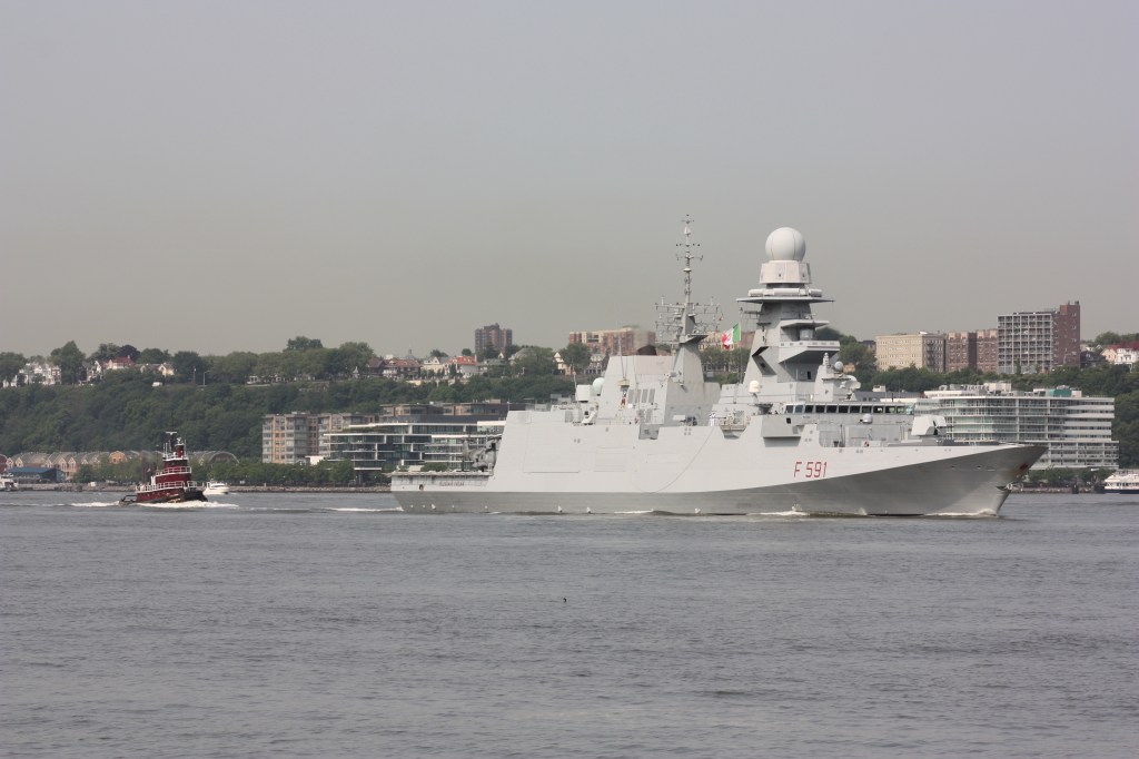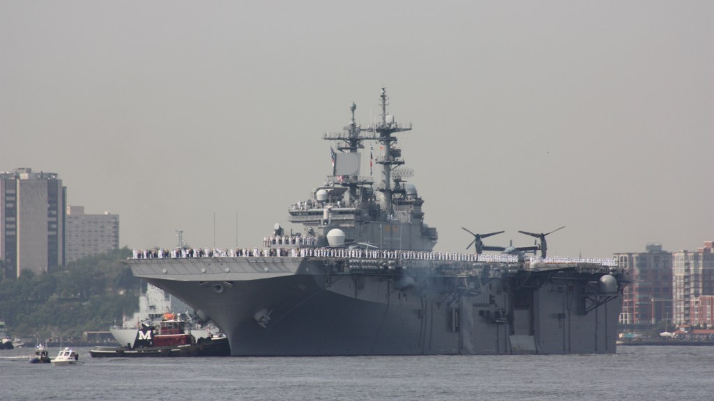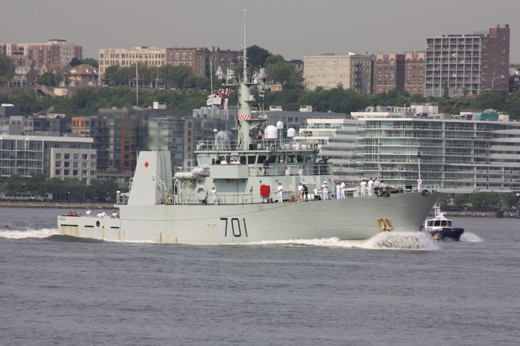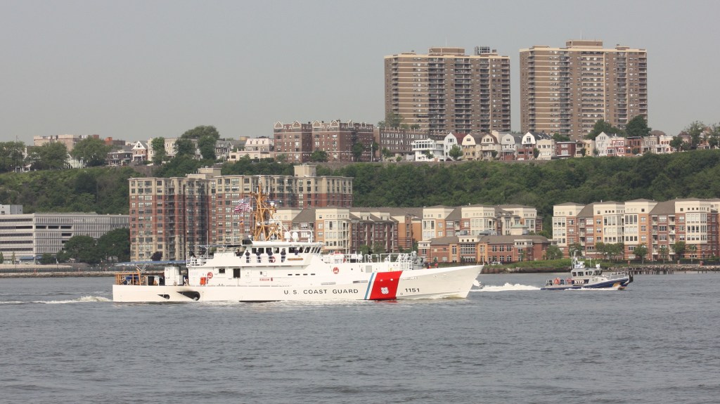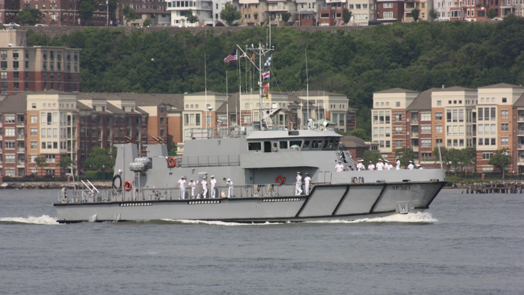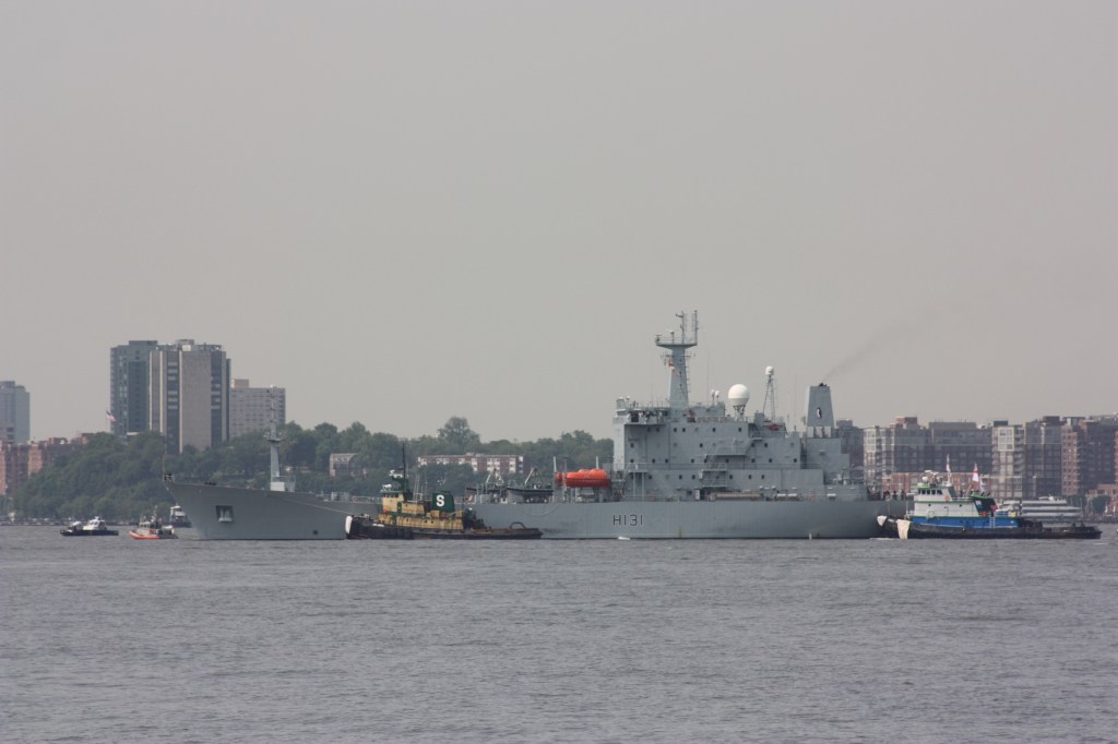 USS Cole led the procession, with the FDNY’s 343 boat visibile on their port sideThe Army Corp’s Gelberman trooped the colors. Hayward did this job last year but that larger crane ship seems to be out of service stillThe US Coast Guard Cutter William Deyampert, down from Boston again, joined the procession with an NYPD RHIBThe unusual looking fast transport ship USNS Newport passed by before heading to her weekend quarters at the Homeport Pier in Staten IslandThe USS Wasp made a sharp left turn into the cruise terminal with help from Moran TowingThe survey vessel HMS Scott also turned into Pier 88 with help from Stasinos and Haugland Group tugsThe Italian frigate Virginio Fasan came up the River before returning to Pier 90, shadowed by Marie J. TurecamoVirginio’s Augusta Westland chopper was out on the rear deck. NYS Environmental Conservation Police contributed a boat to the security detailCanadian patrol boat Glace Bay was part of the procession The Naval Academy contributed four of its yard patrol training shipsMargaret Moran, a longtime favorite of NRN, was on standby for assistanceDonJon is not usually in the bunkering business, but Douglas J seemed to be keeping a fuel barge out of the way, which was later brought to the Wasp’s location south of Pier 88. On their port is USCG small harbor tug Hawser.A Coast Guard Auxiliary patrol was using a civilian boatAnother Auxiliary team was more officially equippedNYC’S Department of Emergency Management apparently has a boat, not seen on the River before.A trio of F18s and an E2 Hawkeye early warning plane flew in formation up to the Cuomo BridgeThe E2 got left behind on the way backNavy Seahawk choppers, probably flying off of the Wasp, made loops over the riverThe NYPD kept a lower level eye on thingsAn Air Force VIP transport Huey arrived just as the ships were dockingFireboat Three Forty Three was part of the welcoming committee