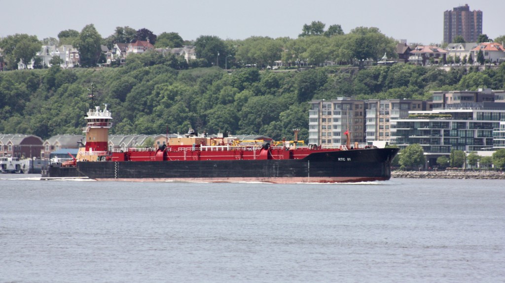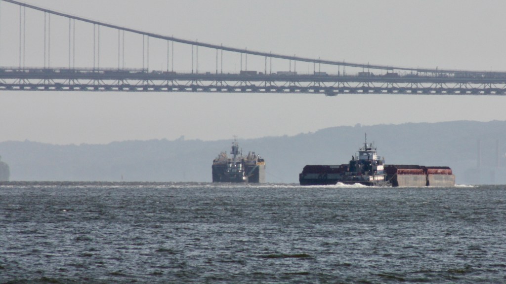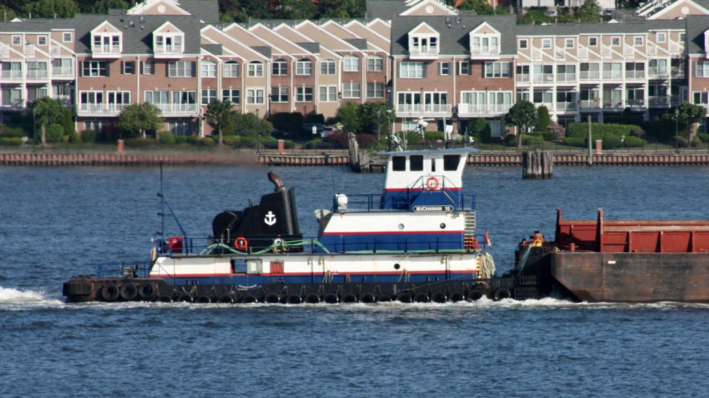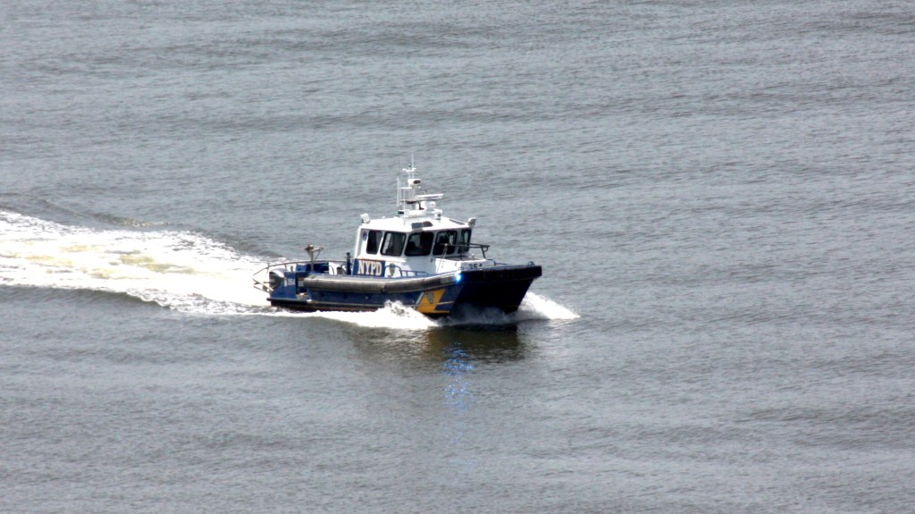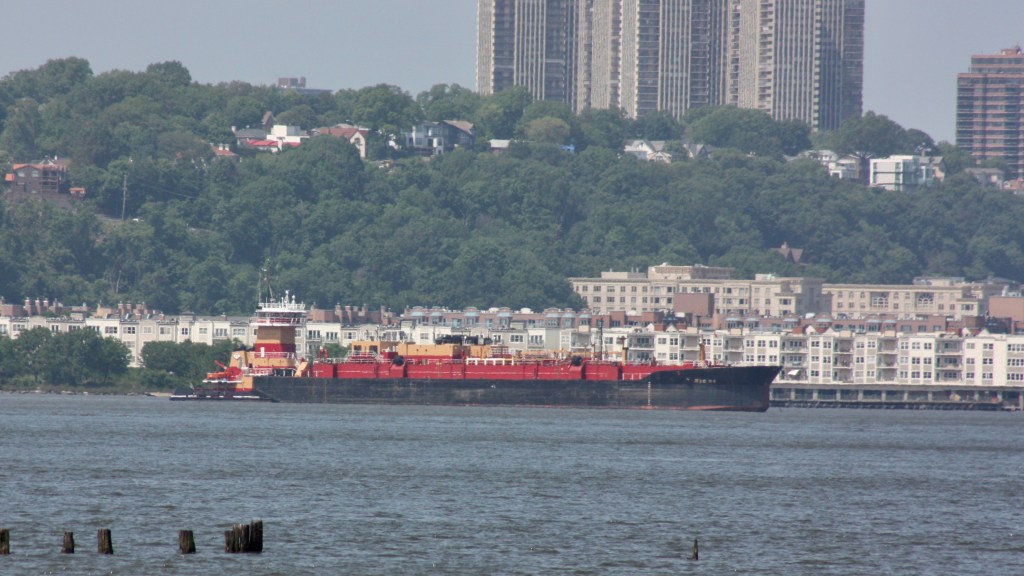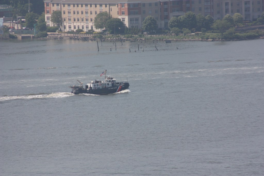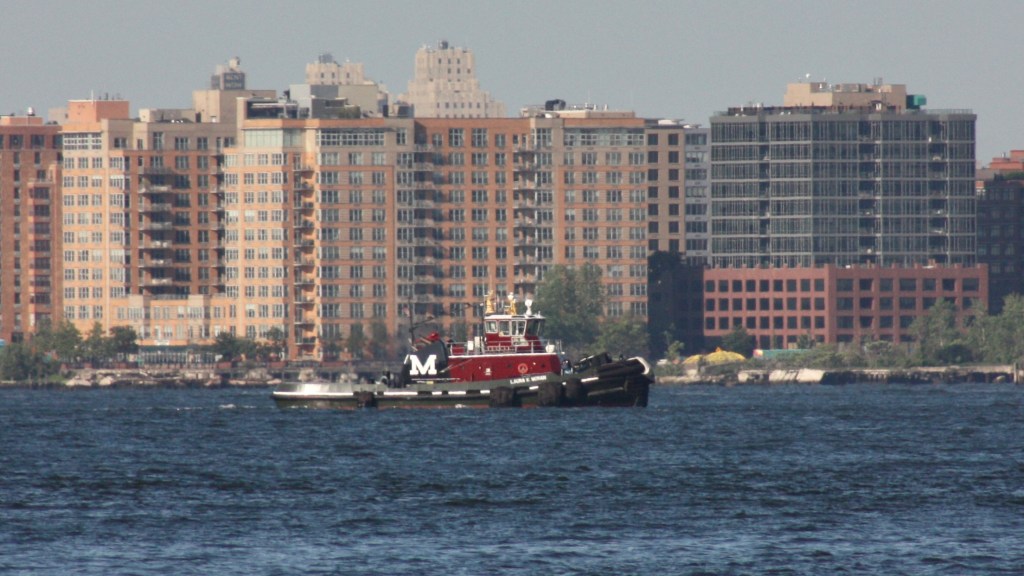 USS Wasp made an early Tuesday departure from Pier 88, with sailors and marines lining the deck.Laura K Moran stood by to assistAs did NRN favorite the Margaret MoranAnd a Stasinos pusher with a Coast Guard 29 footer providing security in the backgroundCoral Coast had a light cement barge heading for Lafarge Ravenna on Memorial Day morningTimothy L Reinauer spent Memorial Day anchored off 96th Street with RTC 84 on the way back from Newburgh before heading for Carteret Monday nightHey, it’s Franklin! Franklin Reinauer, the smallest tug in the Reinauer fleet and not to be confused with the much larger B. Franklin Reinauer, made a rare trip down the North River Monday. Franklin was pushing the 300’ long RTC42 and coming back from the Innovative Surface Solutions dock south of Albany on unknown business.B. Franklin Reinauer was on the North River the next day, returning from Providence with a light RTC81 and anchoring off 72nd StreetBuchanan12 was on the way back north early Tuesday with empty hoppersPassing the Vane tug Philadelphia which spent Tuesday anchored off Edgewater with the light Double Skin 507 bargePhiladelphia and Double Skin 507 headed for the Harbor Tuesday evening, passing the anchored B. Franklin with a power boat squeezing by in betweenPoling-Cutler’s Marylin George returned from New London Tuesday morning with the Noelle Cutler barge light. They anchored off Riverdale for a few hours… And then headed back to the Harbor as Canadian smoke began to haze the RiverDonJon’s Thomas D Witte was heading north with empty hoppers Tuesday, probably to collect scrap in AlbanyCoast Guard 65’ harbor tug Hawser left the Bayonne station and headed up to the Coast Guard mooring south of the GW Bridge for the day.An NYPD 35 footer also was on the North RiverThe NYPD has more than one way to keep an eye on the RiverThis mystery boat was first seen on the River last November. It is a former Marin County, California sheriff’s boat, which has been only partly repainted. Does not ping on AIS and current owner is unknown. A pair of what appeared to be F35s or maybe F22s flew down the River Tuesday.