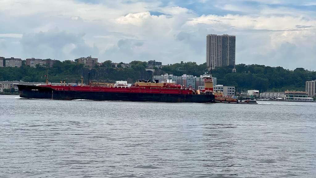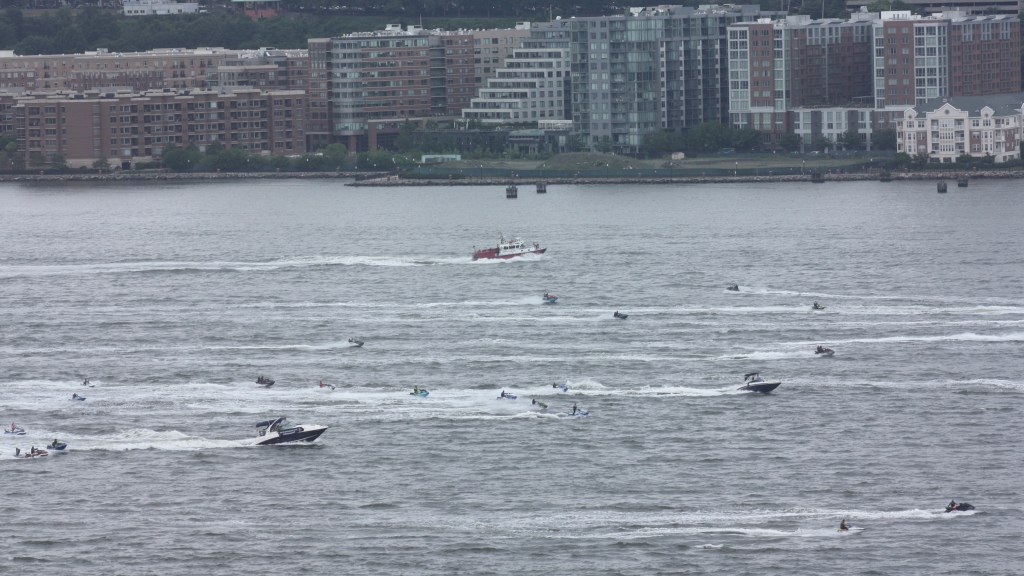 The invasion in full swing, with a Jersey City fireboat providing part of the official escort.Coral Coast was returning to Ravenna with a light cement barge on Wednesday.Vane’s Philadelphia brought a loaded tank barge to anchor on the North River Wednesday as it does from time to time.The Canadian patrol ship Harry De Wolf was visiting Pier 88. Vane’s Fells Point brought a refueling barge Friday.Fells Point later left without the bargeAnother Vane Brothers tug brought the barge back, passing a J24 sailboatAnd following on the heals on Buchanan12 with their usual haulSeven Seas Navigator was docked on the opposite side of Pier 88 from the Canadian navy ship, having arrived from Montreal and preparing to set sail for ReykjavikJonathan C Moran was on hand, tied up at Pier 90, to assist the Navigator leaving the dock.Dean Reinauer and RTC 106 came up the North River Friday evening heading for NewburghCenterline’s HMS Liberty came up the North River with what looked like a bunkering barge on the hip, not a typical move for this company. The pair travelled up to the Kingston anchorage area and then returned to the harbor, perhaps bunkering a vessel up there.Kristin Poling was coming south with the Eva Leigh Cutler barge ThursdayMarilyn George was coming the other direction with the Noelle Cutler barge loaded on SaturdayThe Timothy L Reinauer/ RTC 84 combination returned from Albany light on Saturday afternoonThe Coast Guard cutter Beluga came up the North River from its Sandy Hook base to help monitor the jet ski paradeArmy Chinooks were over the River earlier in the weekAs was an osprey, not often seen on this part of the River