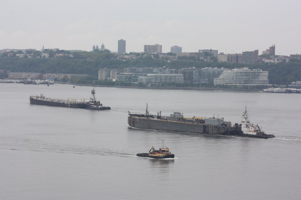 On Sunday, the SSI magnificent passed the Pier 66 moorings, heading to sea after discharging their cement cargo in Catskill, NY.A cargo of cement was brought south by the Sapphire Coast on Monday, passing the anchored Noelle Cutler barge and accompanying tugThings got busy as Saint Emilion prepared to overtake the slow-moving Sapphire on two whistles while passing the Army Corp’s Gelberman on one.Shannon Dann had interesting deck cargo on the wire headed for the Port of Albany on Monday.Patrice McCalister arrived on the North River Tuesday with her barge heads-to-tails on the hip and went on to anchor off YonkersThis pair of light tugs came down the River Monday, seemingly involved in the work happening at the Spuyten Duyvil Amtrak swing bridge.CMT Pike had a crane seemingly coming from that work site Saturday.A survey ship headed upriver MondayA stand-up paddle boarder came down river against the flood.And took a dip to fight the heatNorwegian Joy received a fuel deliver from Vane’s Fort SchuylerFort Schuyler later headed for the Upper BayDean Reinauer and RTC 106 returned from a Newburgh run and headed for the Bay after spending some time anchored on the North River off Edgewater.