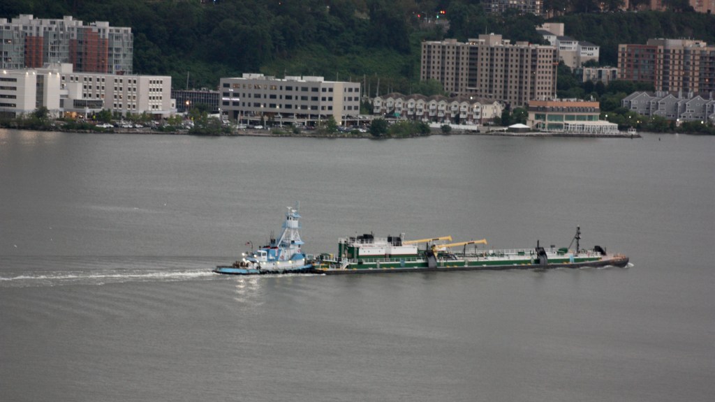 The wallboard plant in Buchanan is one of two receivers of bulk freight on the Hudson in Westchester, the other being the Yonkers Domino refinery. On Friday, a 655’ bulk ship, about as long as any vessel likely to be seen heading up the North River beyond the cruise terminal, arrived with a shipment of gypsum from Garrucha, Spain, preceded by two Moran tugs from the Harbor to help with docking as usual. Weekend traffic was otherwise typical, with Reinauer and Dann Marine moving oil products cargos north as waves of thunderstorms and heavy rain continued to move through the area.