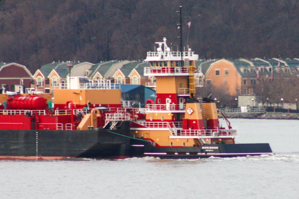 New York City was bracing for significant snow fall Monday night, though the marine forecast was not very alarming, with winds gusting to just about 40 knots. Observed traffic included sugar, and empty cement and oil products barges.