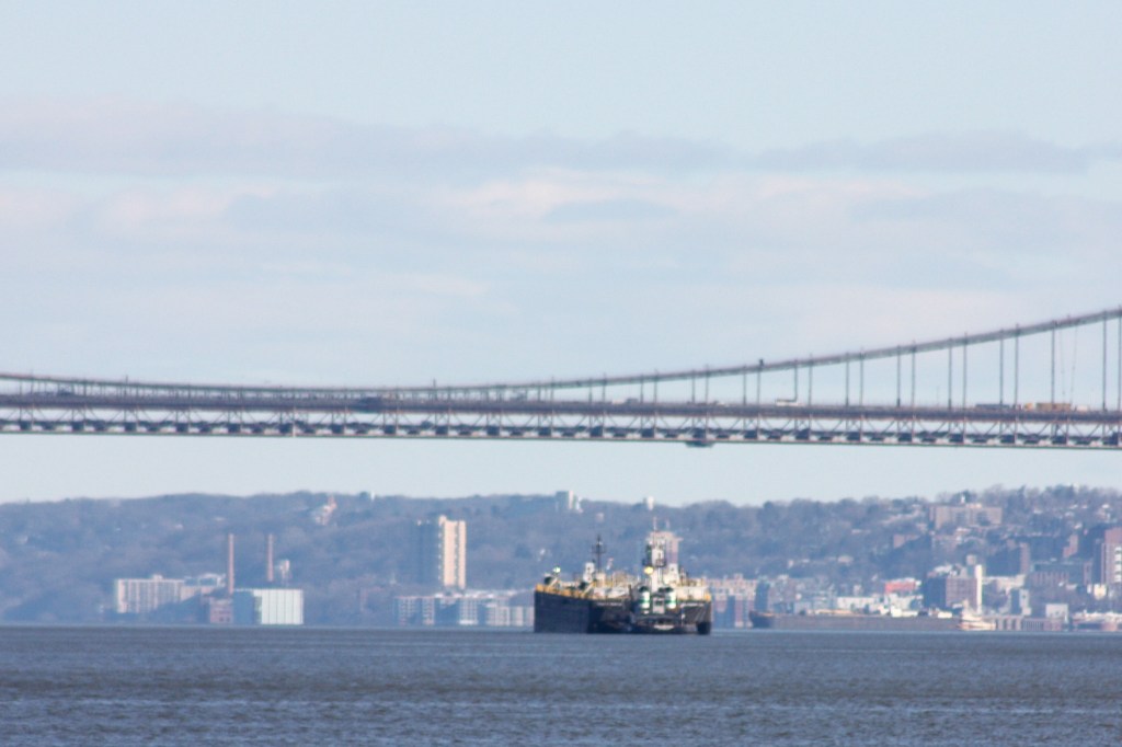 Vane’s Philadelphia spent the early hours of the Monday holiday anchored off Edgewater with a tank barge before heading for Port Newark. Yonkers is visible in the background as is the tug Linda Sue anchored off Spuyten Duyvil.