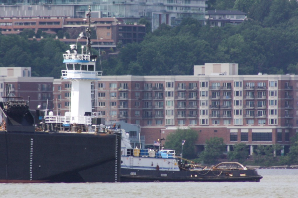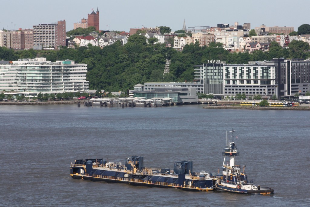 The Josephine ATB returned from Albany and headed for anchorage in the Upper Bay, passing the beams from the World Trade Center serving as a memorial in Weehawken.