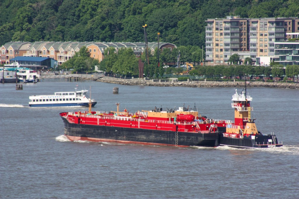 Two offshore tanker barges remained anchored in the North River Tuesday after Monday’s storm. Centerline’s The Beatrice was off Edgewater paired with a large barge.