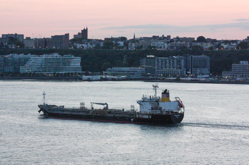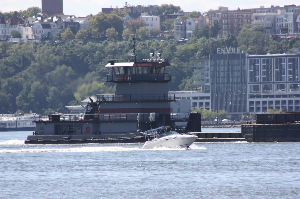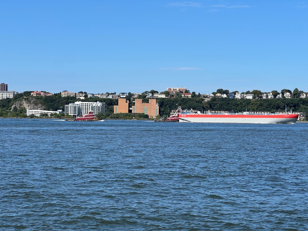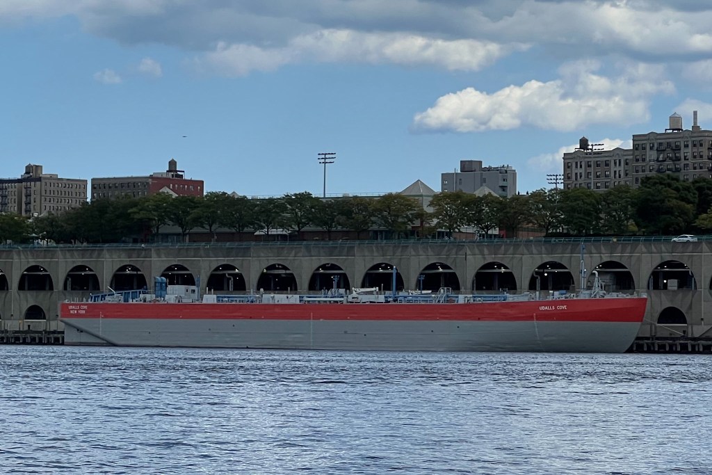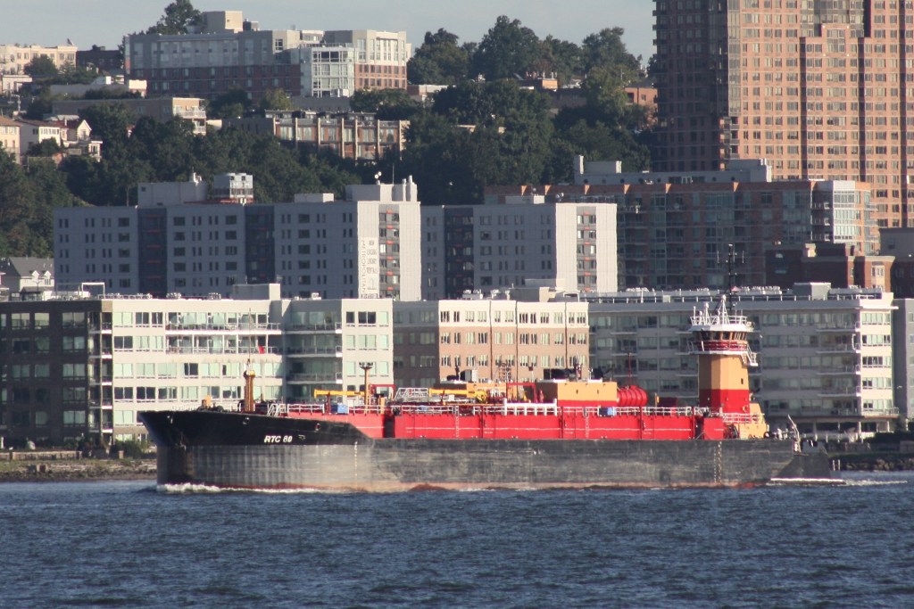 The NYC Department of Environmental Protection’s barge Udalls Cove dates back to a time in the 1980s when treated sewage sludge was still hauled 100 miles out to sea for dumping. Nowadays, sludge is ferried between D.E.P. plants by small tankers and converted to a fertilizer product, and the Udalls Cove barge usually sits tied up at Wards Island as a backup. But this week, the barge was back in service, brought to the North River wastewater plant by a pair of McAllister tugs. Perhaps the barge’s is needed due to the usual tankers being out of service. Two of the DEP’s five tankers are currently not pinging AIS and a third has been tied up at Wards Island for the past day at least.
