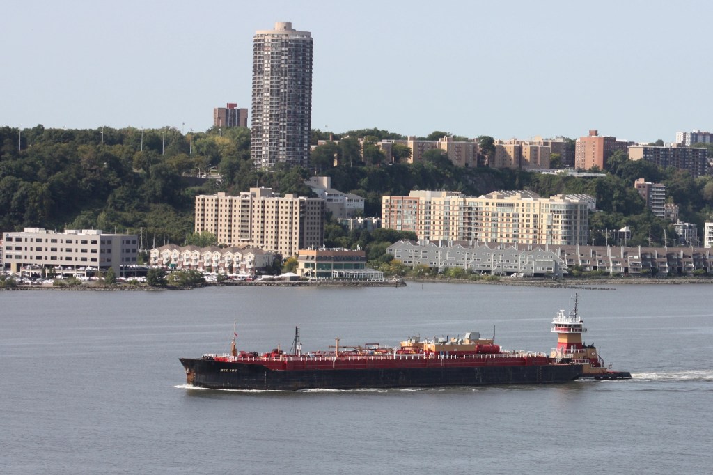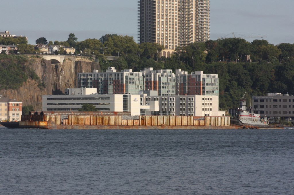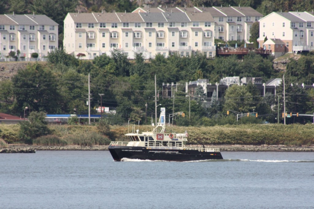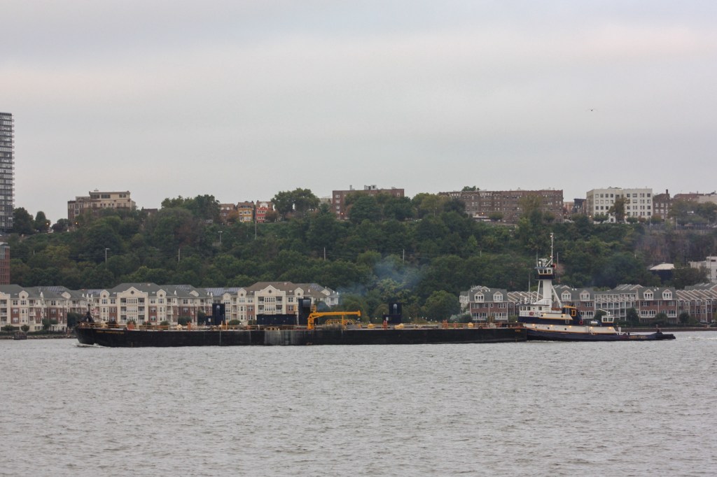 Cement has been moving on the North River this week. Just after sunrise Tuesday, Coral Coast brought a loaded cement transporter barge down from the Holcim plant in Ravenna (formerly known as the Lafarge plant in Ravenna). They were heading for the terminal on Flushing Bay.Just 12 hours earlier at sunset Monday, Pearl Coast came the other direction with an empty cement transporter barge heading back up to the plant.Carver Marine Towing’s Mackenzie Rose came down from the company’s Coeymans port facility Monday with a high-sided hopper loaded with stone. They headed for the Greenville flats off Jersey City.After the DEP’s old Udalls Cove barge was called out of reserve last week to service the North River sewage plant (see September 10 update), the plant was back to being serviced by tanker again Monday, with the Red Hook doing the honors though three of the agency’s five tankers appear to remain off line.The Army Corps Of Engineers patrol boat Moritz made the rounds Monday.The Reinauer Twins/RTC 104 ATB, one of the the larger Reinauer combinations based in New York, returned to the harbor after delivering product in Albany and Newburgh.On Tuesday, the similarly sized Janice Ann/RTC 103 was heading north with a cargo, passing DonJon’s Mary Alice with a mud scow.Harley Marine’s Robert IV returned to the harbor Monday after a trip upriver.DonJon Marine’s Paul Andrew was standing by at the DSNY’s Pier 99 transfer facility for waste paper on Tuesday.A bit further south by Pier 90, another DonJon crew on the tug Mary Alice and the dredge Delaware Bay were commencing seasonal dredging operations for the cruise terminal.Further south again on Pier 88, DonJon’s Atlantic Enterprise waited with an empty mud scow in reserve for the dredgers with Norwegian Joy looming on the north side of the pier.Joy was being refueled with help from Vane’s Cape Fear as passengers disembarked. Joy is making cruises up to Quebec City through September before resuming Bermuda runs in October.