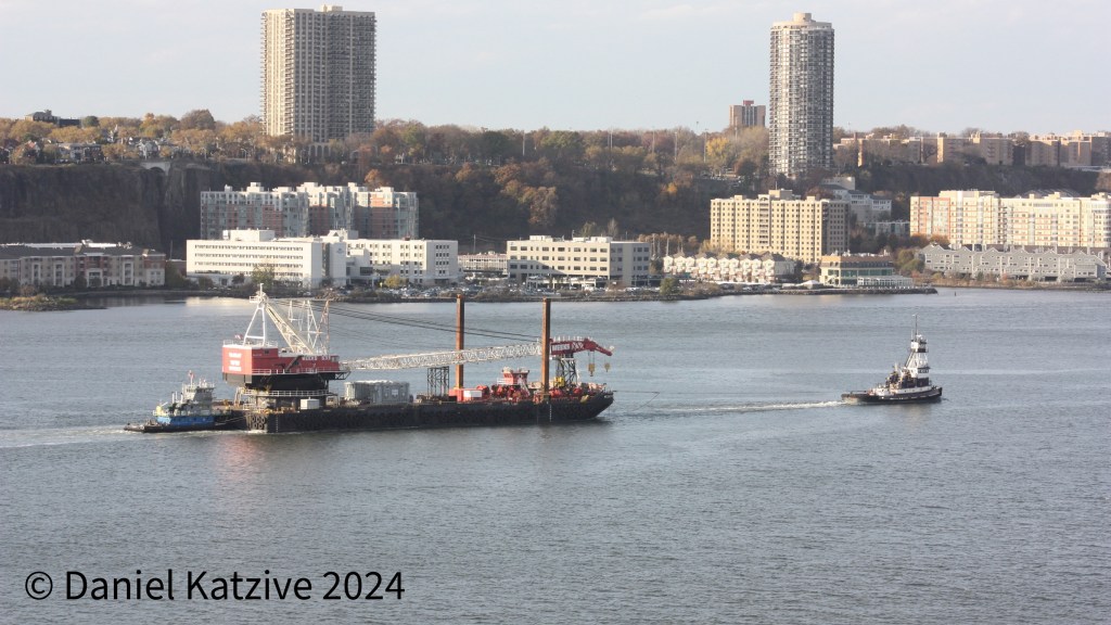 Dann Marine’s Gulf Coast, I believe based on the Delaware River and not seen recently seen on the North River, came up from Philly with Weeks Crane 533 on the wire on Wednesday. Haugland’s Miss Madeline joined the tow in New York Harbor and the trio continued up north to the Hudson, NY area on unknown business.