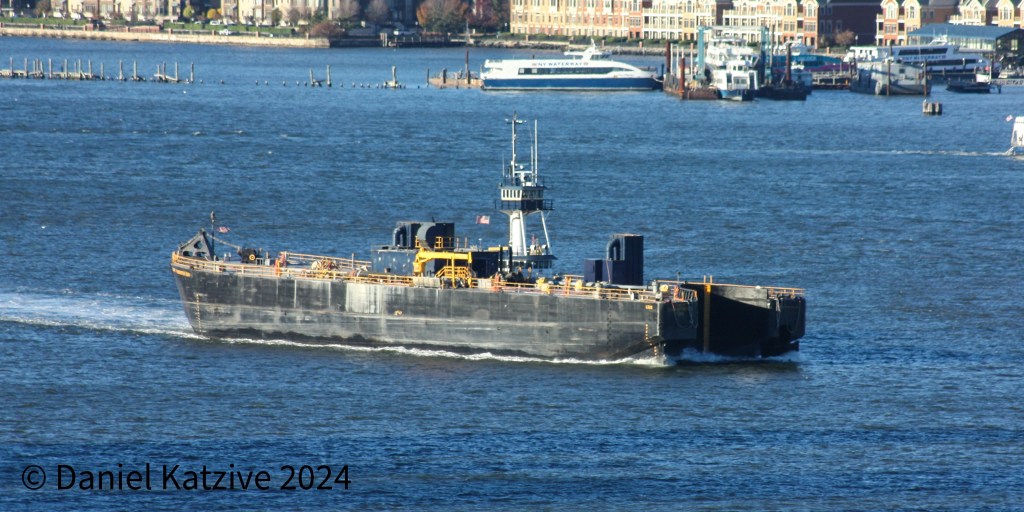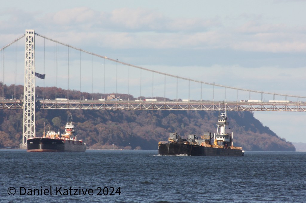 Dann’s Treasure Coast brought a loaded cement barge down from the Holcim cement plant in Ravenna, NY on Monday. They passed the Haggerty Girls/RTC 107 ATB anchored off Edgewater and were heading for the Holcim cement distribution terminal in College Point, Queens, at the mouth of Flushing Creek. The GWB’s Veterans Day flag is visible on bridge’s west tower. On Wednesday morning, they were headed back in the other direction with the barge light and made up heads/tails on the hip.