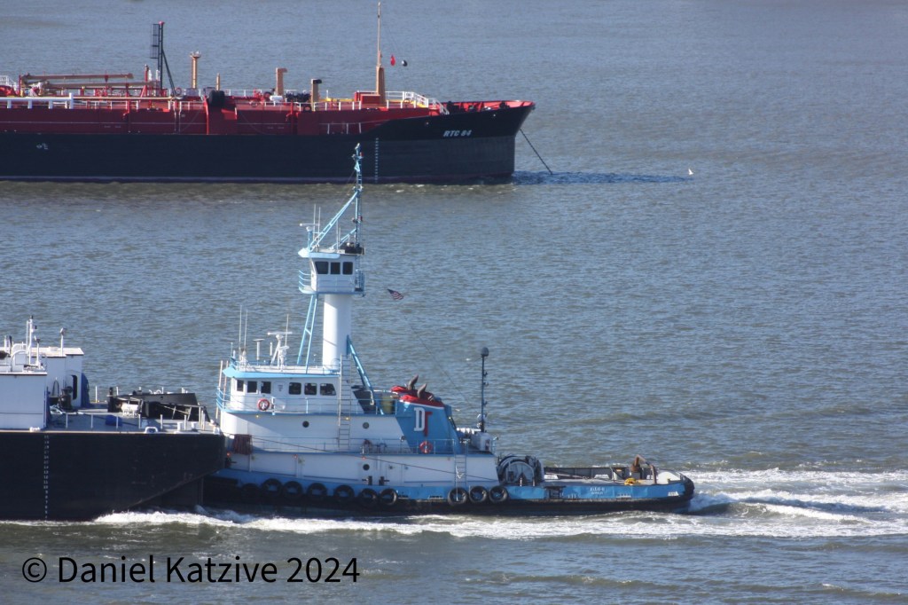Dann Ocean Towing’s Allie B returned to the harbor Tuesday after a run up to Albany with the Double Skin 43 barge, passing an anchored Reinauer ATB off 72nd Street.