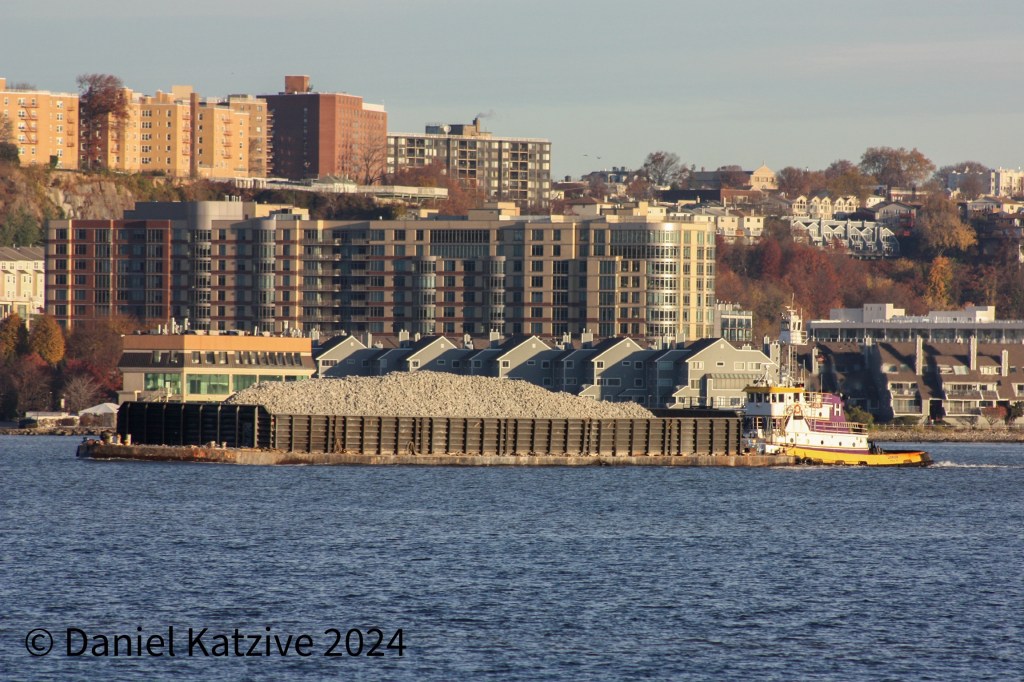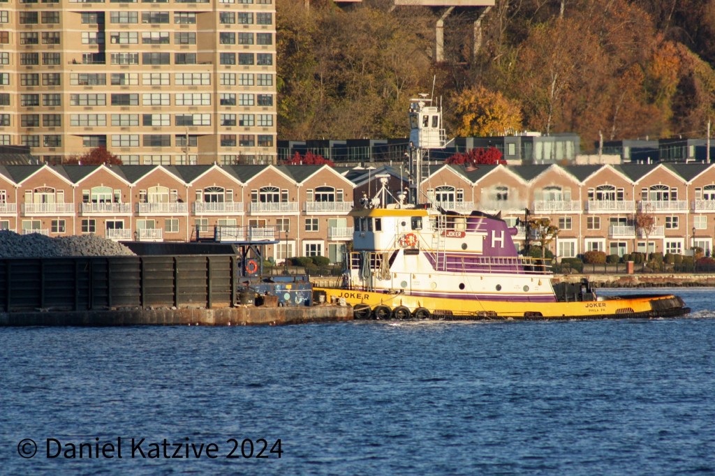 Hays Tug Joker came down the North River Tuesday morning with a high-sided hopper loaded with stone, coming down from the quarry dock in Hudson, NY. Joker seems to be doing a fair amount of Hudson River work this year. By Wednesday morning, Joker was already heading back north up the river.