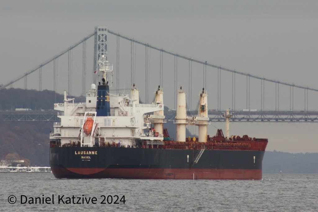A cargo of Spanish gypsum moved up the North River Wednesday aboard the Swiss-flagged 650-foot bulk ship Lausanne. They were heading for the wallboard plant in Buchanan, NY. As usual, a pair of Moran tugs came up the river ahead of time to help with docking at the factory. Lausanne is one of only about a dozen ocean-going Swiss-flagged ships, all of which are bulkers. Her homeport is Basel but she would be unable to ever have visited that inland facility which is serviced by inland vessels.