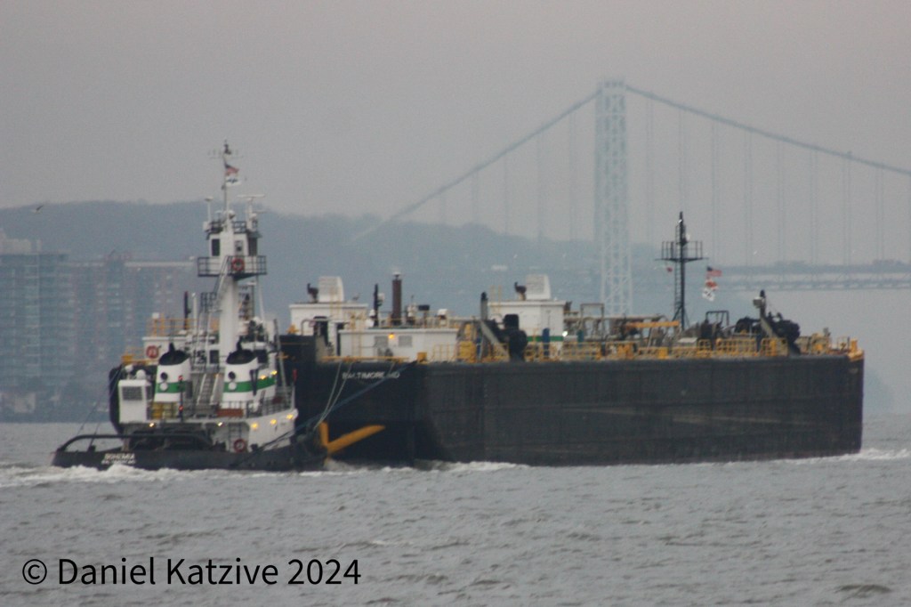 Vane’s Bohemia brought a light Double Skin barge up to anchor on the North River Thursday morning, joining a number of combinations getting out of the heavy winds forecast for that day.