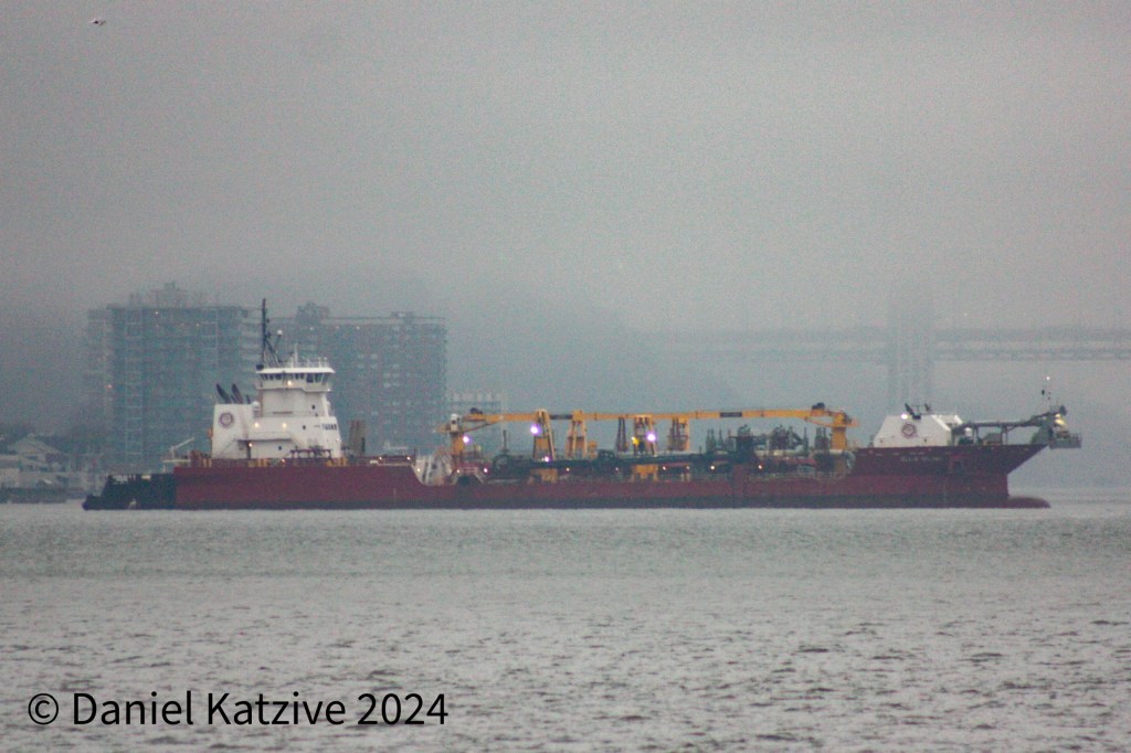 Hardly a week has gone by this winter without a gale warning in NY Harbor and, as a result, we are seeing more variety of vessels visiting the sheltered North River than usual, albeit in less than ideal conditions for photography. Wednesday morning has brought the hopper dredge Ellis Island and her tug Douglas B Mackie to anchor off Edgewater. They have been working off Fire Island and we last saw this combination anchored here during a winter storm back in January.