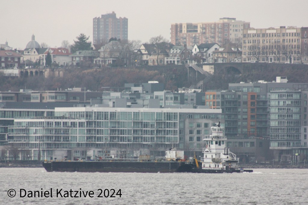 American Petroleum’s towboat Diane B returned to the harbor Tuesday morning with the barge James Joseph. We only see this tug occasionally on the North River and with only about 270 feet of combined length this is probably the smallest tank barge/tug pairing working the lower Hudson. They were returning from the small fuel terminal in New Hamburg, NY, where the small size and shallow draft is presumably helpful.