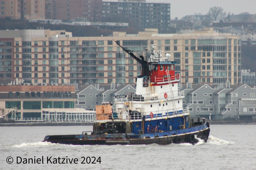 Liz Vinik came up the North River early Tuesday without a tow, heading for Newburgh. This is the first time I’ve seen this tug, which was built in Oyster Bay in 1962, making her one of the oldest tugs working in NY Harbor. According to tugboatinformation.com, her original name was Esso Maryland. On this trip, Liz made a quick stop at the Buckeye Terminal in Newburgh and then came straight back home, returning to NY Harbor by midnight. I don’t know the purpose of the voyage.