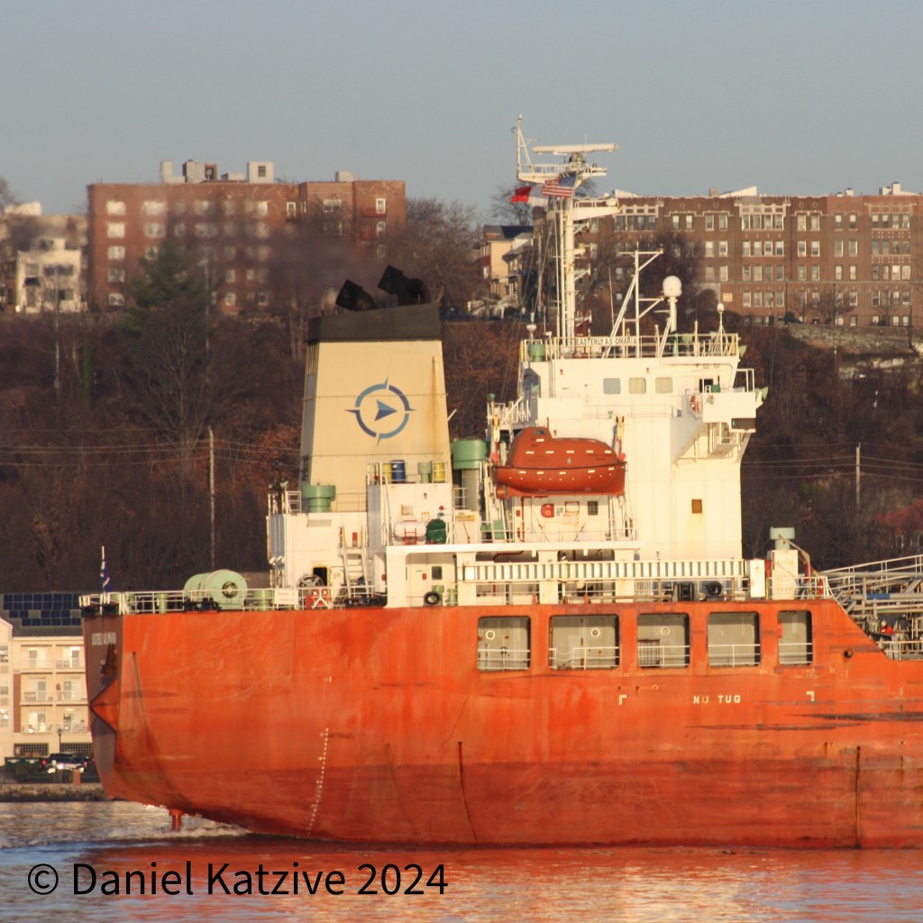 Easterly As Omaria, a small 20k deadweight ton foreign-flagged tanker came up the North River early Wednesday en route to a terminal in Albany from Canada. She was very high in the water and one possibility is that she will be loading an ethanol cargo for export back to Canada.