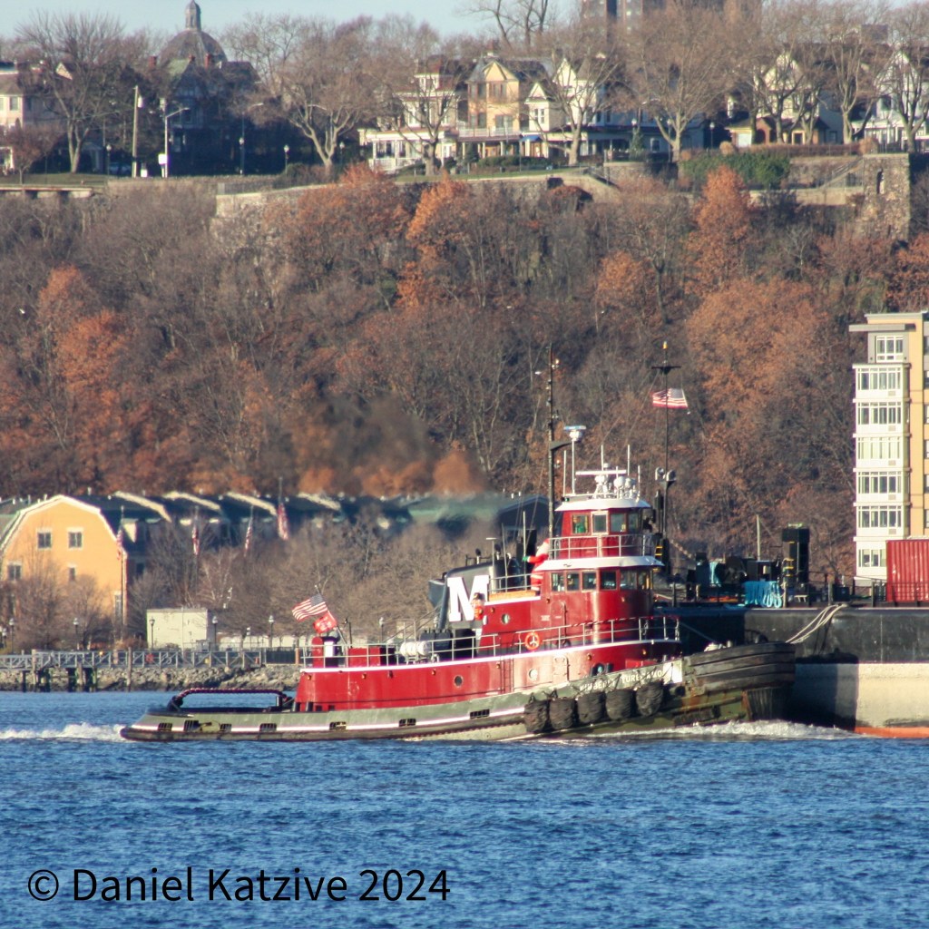 Kimberly Turecamo brought the Moran tank barge Connecticut up the North River on the hip to spend some time at anchorage on Thursday. We see Kimberly sometimes heading up for assist jobs in Buchanan but have not seen her on the river with a barge before as far as I can remember.