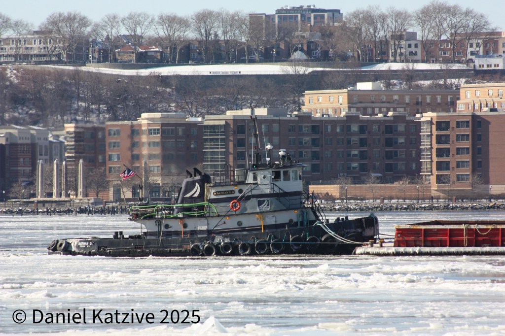 NY State Marine Highway’s Nathan G moved up the North River through ice flows with a hopper barge Wednesday. This week has seen the most significant ice accumulation on the lower Hudson in years.