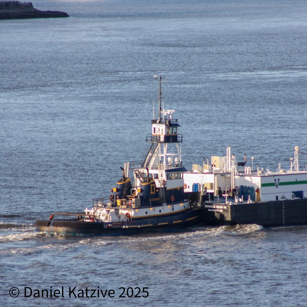 Dann Marine’s Gulf Coast has not, I believe, been based in NY Harbor for a few years, but this winter has been around and doing Hudson River work. On Tuesday, GC came up the North River with Vane Barge DS-43 heading for the small products terminal in Peekskill. They passed the anchored Curtis Reinauer/RTC 82 ATB off North Bergen.