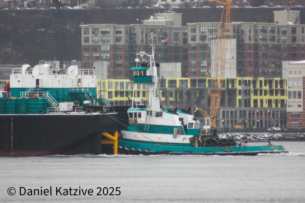 Running lights were still visible as Poling-Cutler’s Marilyn George came down the North River early Thursday, returning from Albany with the Eva Leigh Cutler barge. In the photo, they are passing new residential construction underway in Weehawken.