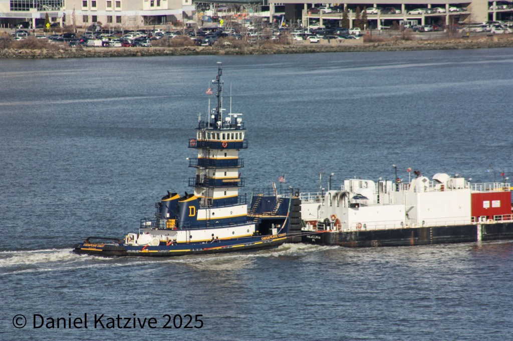 Dann Marine’s Chesapeake Coast came up the North River with the Chesapeake barge loaded on Wednesday and anchored north of the bridge. Friday afternoon, the crew configured for towing astern and headed for the Narrows and out of town, heading south. By Saturday morning they are clearing Cape May.