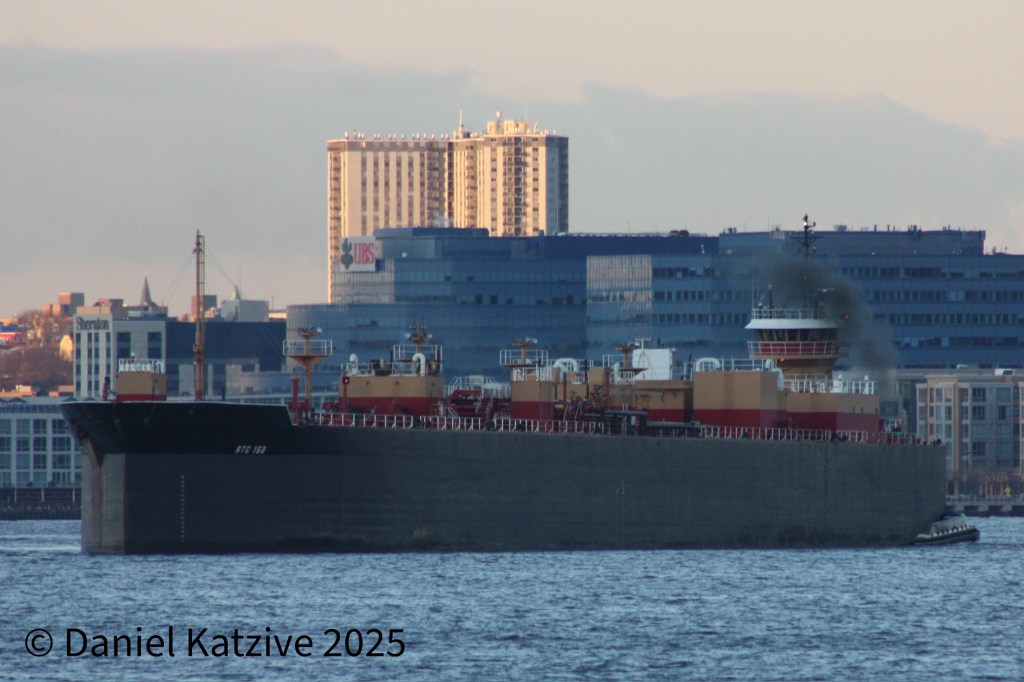 Early Friday, the Meredith Reinauer/RTC 150 ATB came part way up the North River as far as the cruise terminal on the way back from Providence. The unit executed an impressively tight u-turn mid-river and headed for the company’s Kill van Kull yard. The Meredith Reinauer/RTC 150 combination is, I believe, one of the biggest ATBs operating in the northeast, even a bit bigger than Nicole Reinauer/RTC 135. Unlike Nicole/135 which we see periodically heading north, we do not usually see Meredith/150 up here.