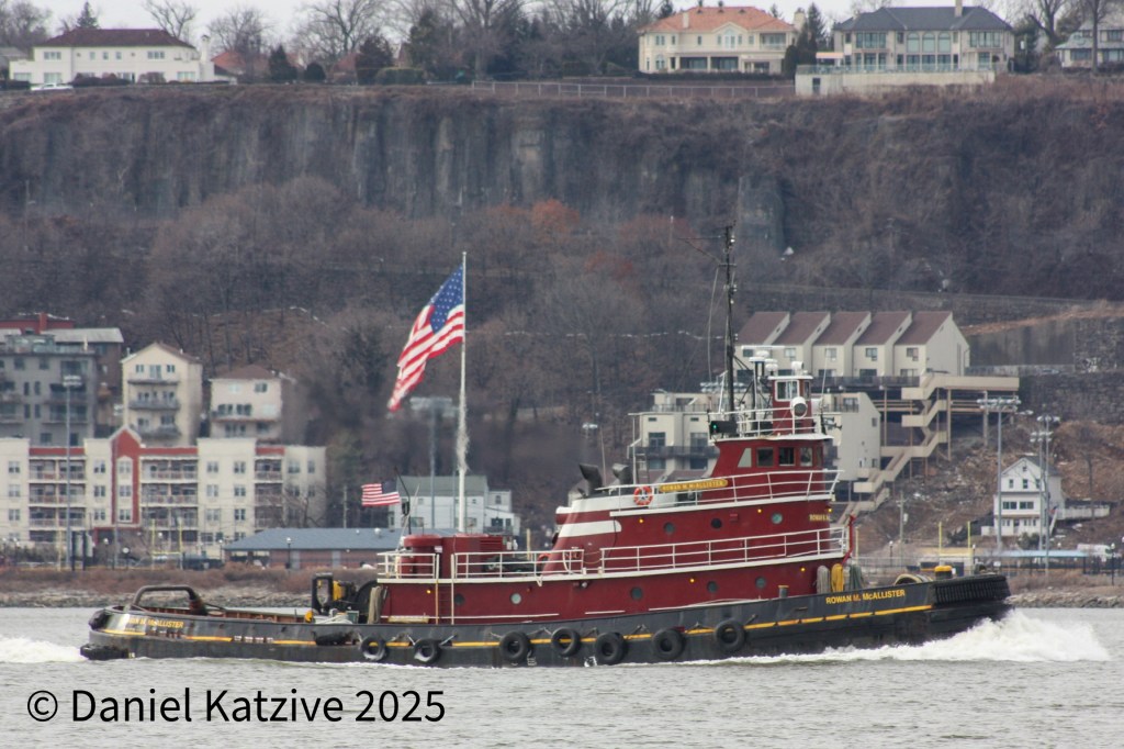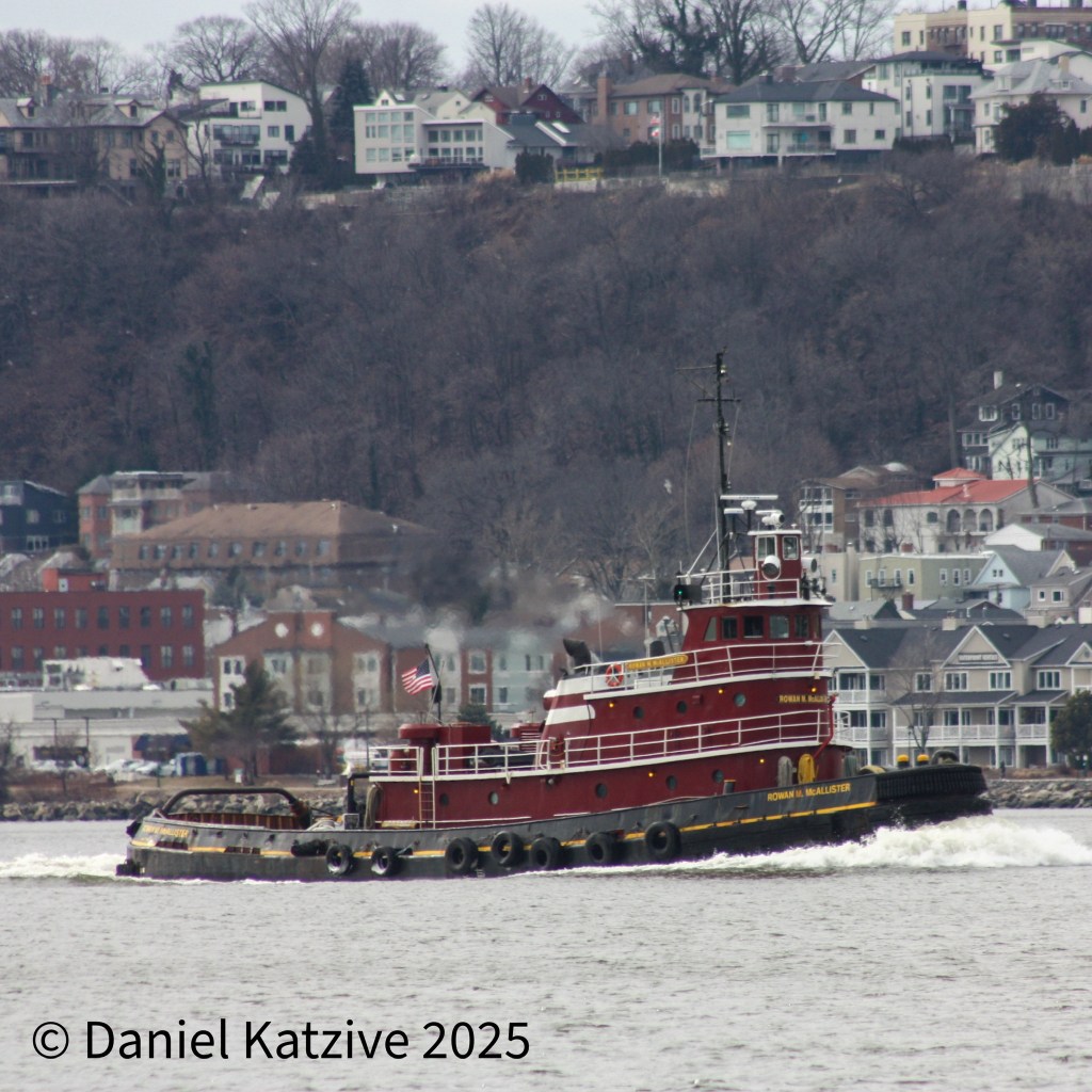 Rowan M. McAllister, vintage 1981 and not generally seen heading upriver, ran light past the bridge Thursday. Rowan went only as far as around Dobbs Ferry before heading back to the harbor, but the next day came back up, I believe with a tanker barge.