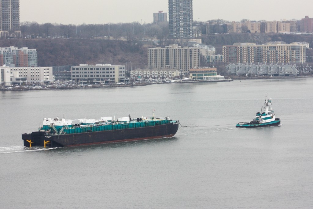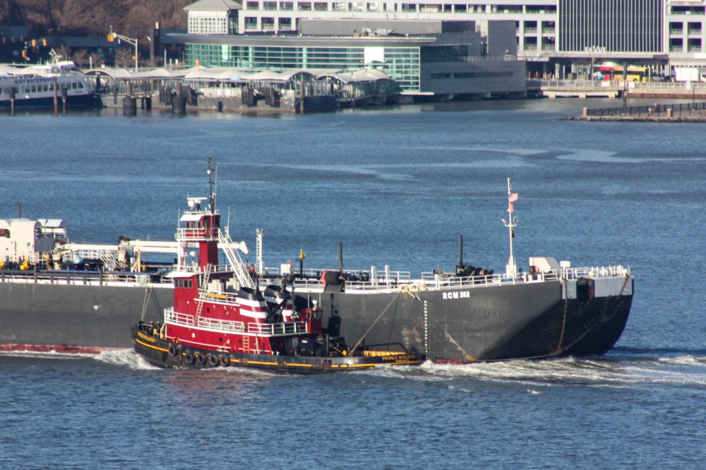 Most of the tugs we see with tanker barges on the North River are in the notch, pushing from astern, but sometimes we see other configurations. On Thursday, Kristen Poling returned from Boston via the Sound with the Eva Leigh Cutler on the wire, and on Friday, Patrice McAllister returned to the harbor with RCM 262 on the hip.