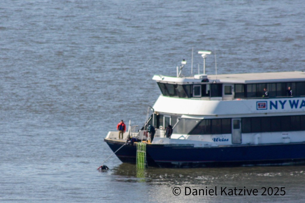 The crew of NY Waterway’s Peter R Weiss ferry practiced man-overboard recovery with a dummy and a rescue net on off West 66th Street Monday.