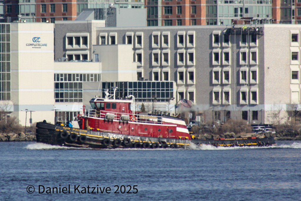 Ellen McAllister, launched in 1967, came down the North River Monday running light and passing the Palisades Hospital in North Bergen. Ellen was returning to the harbor after helping to dock a bulk ship which had arrived at the Yonkers sugar house with a cargo of raw sugar from the Dominican Republic just before sunrise.