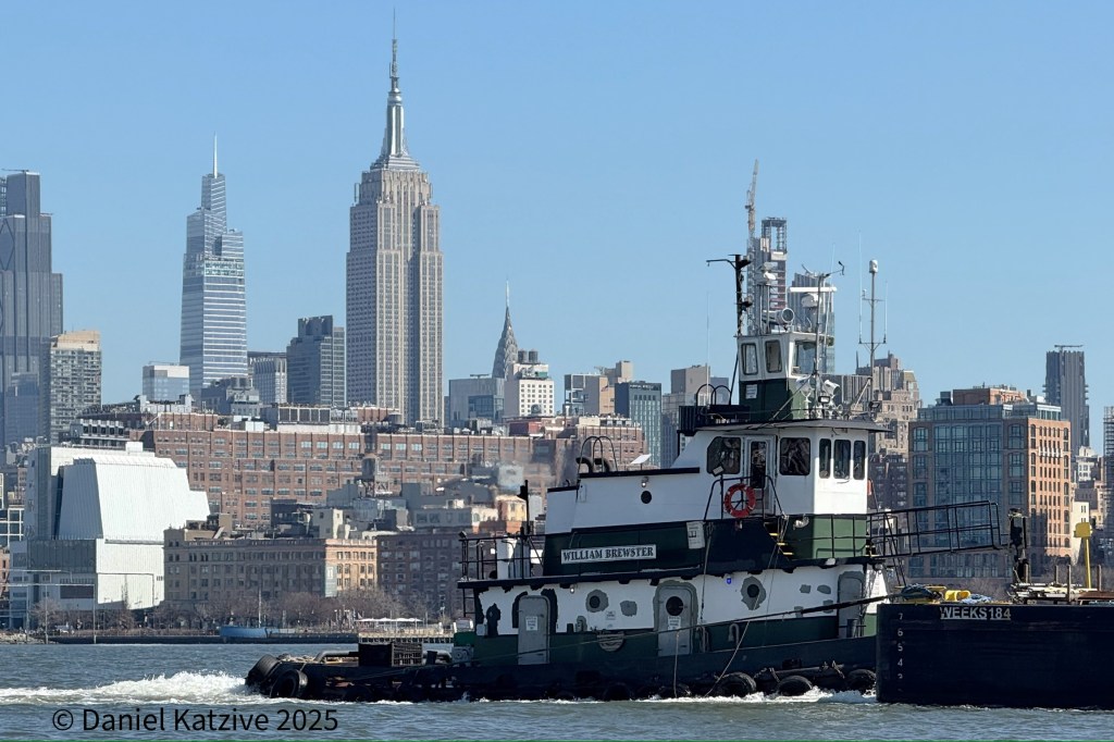 The tug William Brewster brought an equipment barge from the mid-channel coffer dam site off North River Pier 66 back to the Weeks yard in Jersey City on Tuesday. Weeks teams continue to work on the riverbed stabilization project in preparation for boring the Gateway rail tunnel under the river.