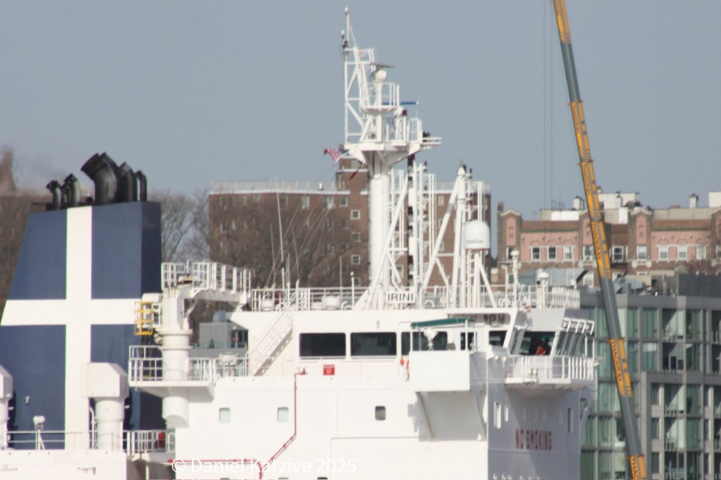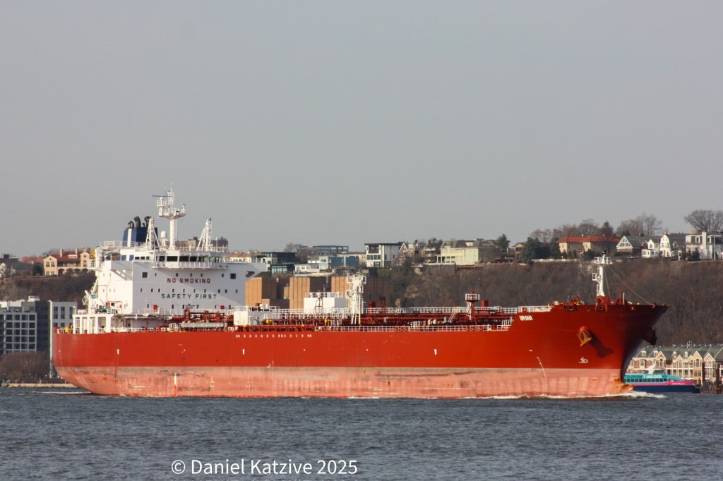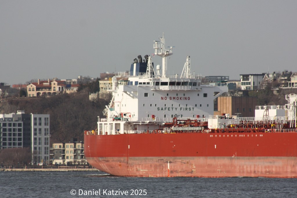 The Greek-flagged tanker Irini came up the North River Thursday, headed for the Port of Albany where she tied up by the feed terminal there. AIS shows port of origin as Novorossiysk Russia and an intermediate stop in Fairless Hills on the Delaware. The routing suggests fertilizer or another agricultural product like molasses as possible cargos. At 50,000 deadweight tons and 600 feet in length, Irini is big by Hudson River standards though she seemed lightly loaded.