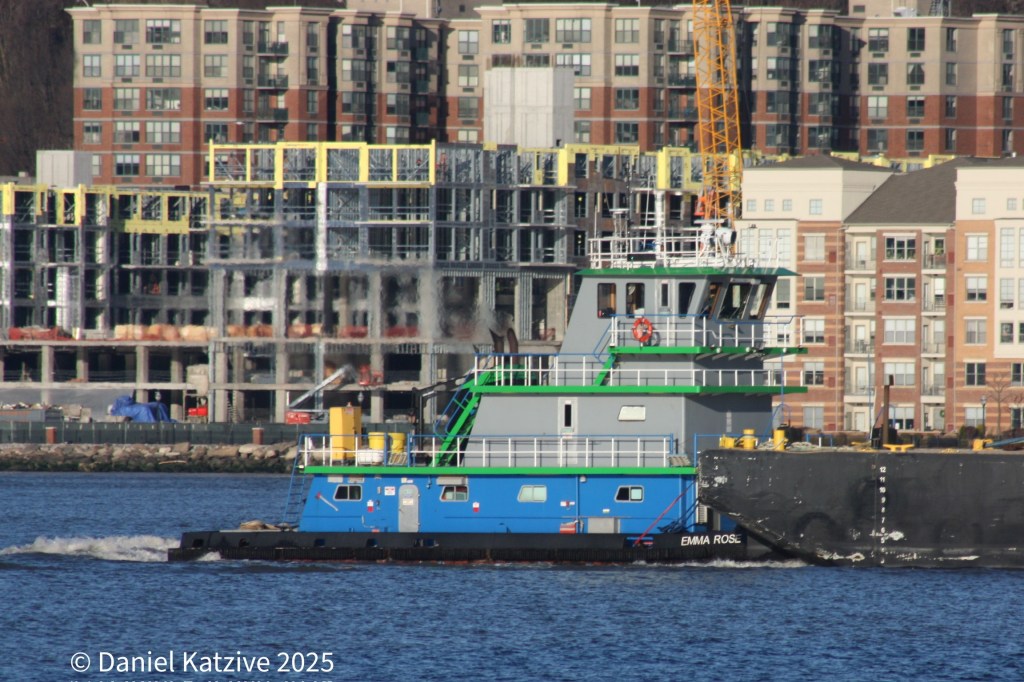 Haugland Group towboat Emma Rose came up the North River early Tuesday, passing Weehawken with a Weeks Company deck barge, heading for Port of Coeymans.