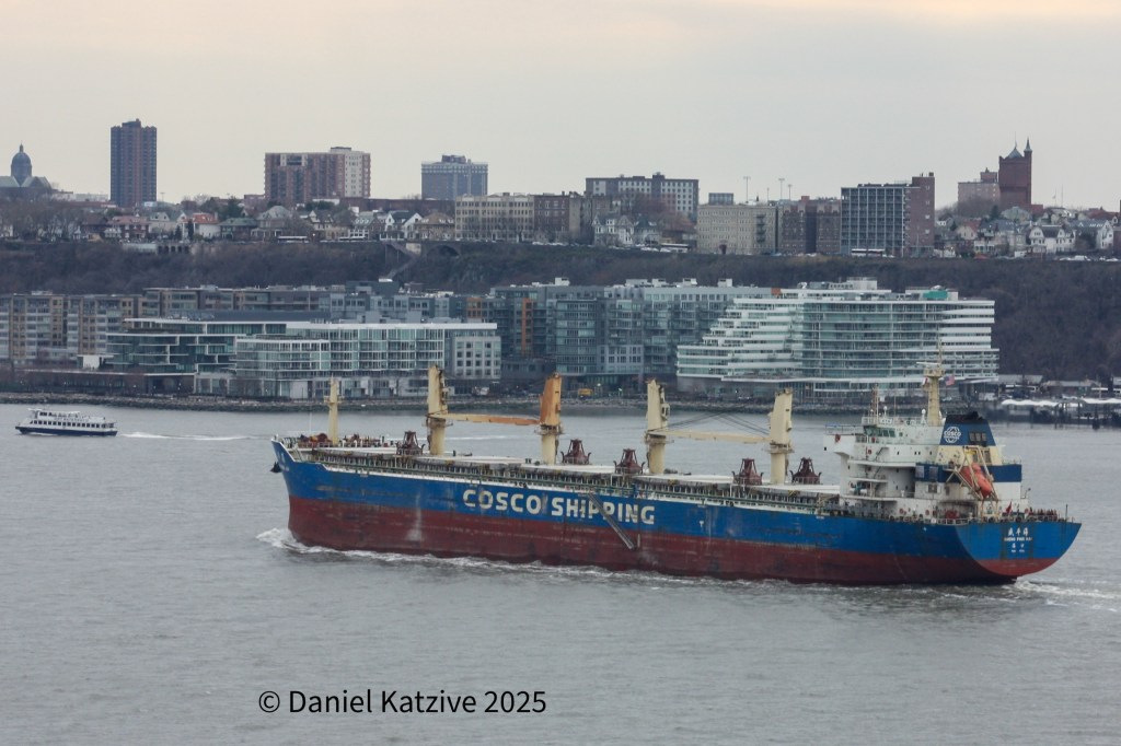 The 620-foot bulk ship Sheng Ping Hai was headed for sea Friday afternoon after discharging a cargo of Chilean road salt at the Port of Coeymans earlier in the week. The administration has a proposal under consideration to levy significant port fees on Chinese flagged and operated vessels like this one which could change logistics equations for shipments like this.