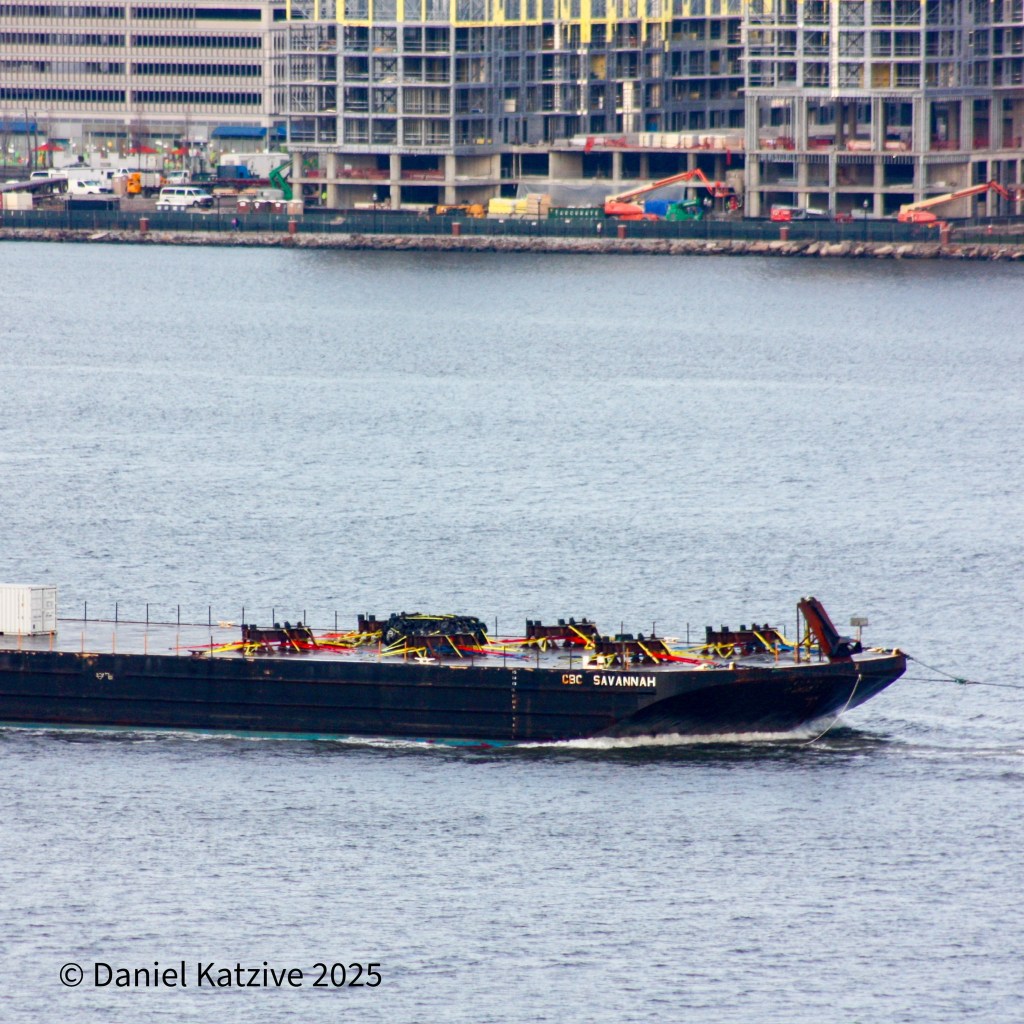 Thomas Dann arrived on the North River from offshore on Saturday with the deck barge CBC Savanah on the wire. Thomas had come up the coast from Charleston and was heading for the Port of Coeymans, perhaps to pick up some project cargo there.