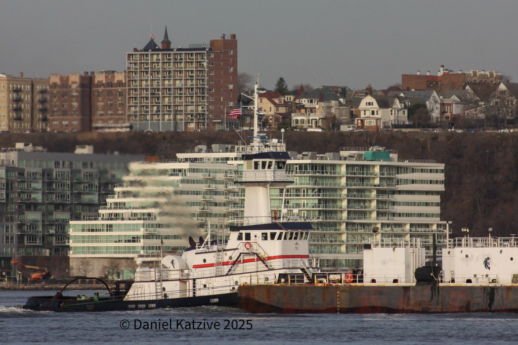 Centerline Logistics big 6,140 HP tug Hawsepiper and the 350-foot barge Flaco (NOT named after the famous owl) have been regulars on the Hudson River route this winter and now into spring. On Friday the pair headed north again with a cargo. On Sunday, they were anchored off 72nd Street with the barge paint clearly showing the ravages of a tough icy winter.