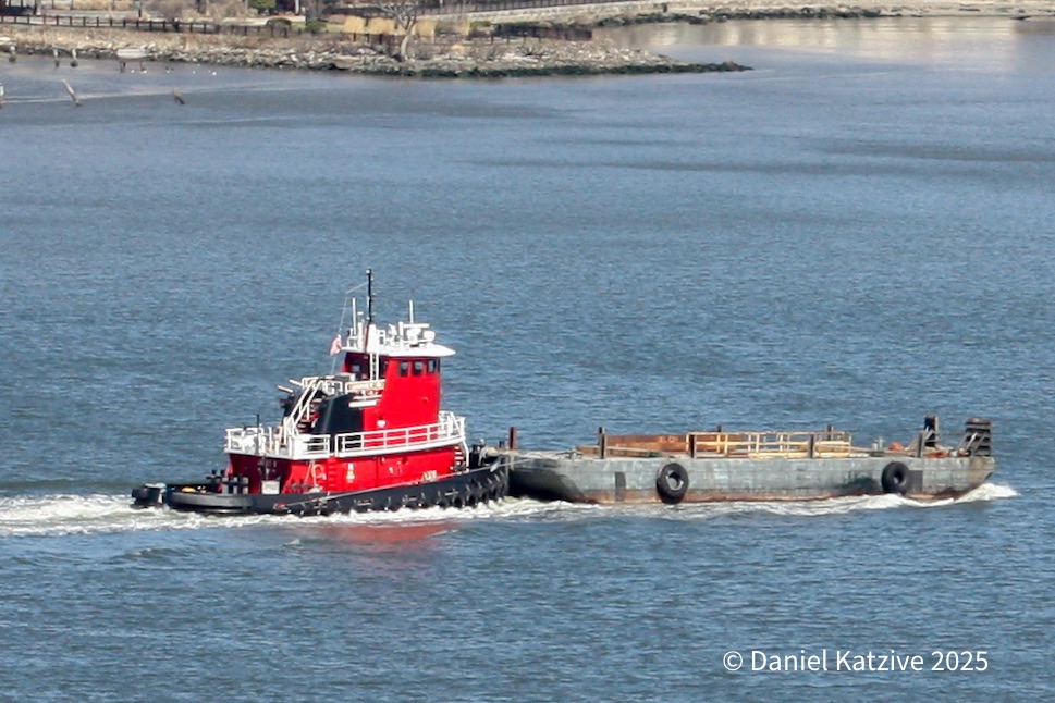 Janet D, a 1320 HP tug belonging to Construction and Marine Equipment of Elizabeth, has been making trips up to the Yonkers sugar plant from her base on the Arthur Kill with a deck barge, presumably for some work happening up there.