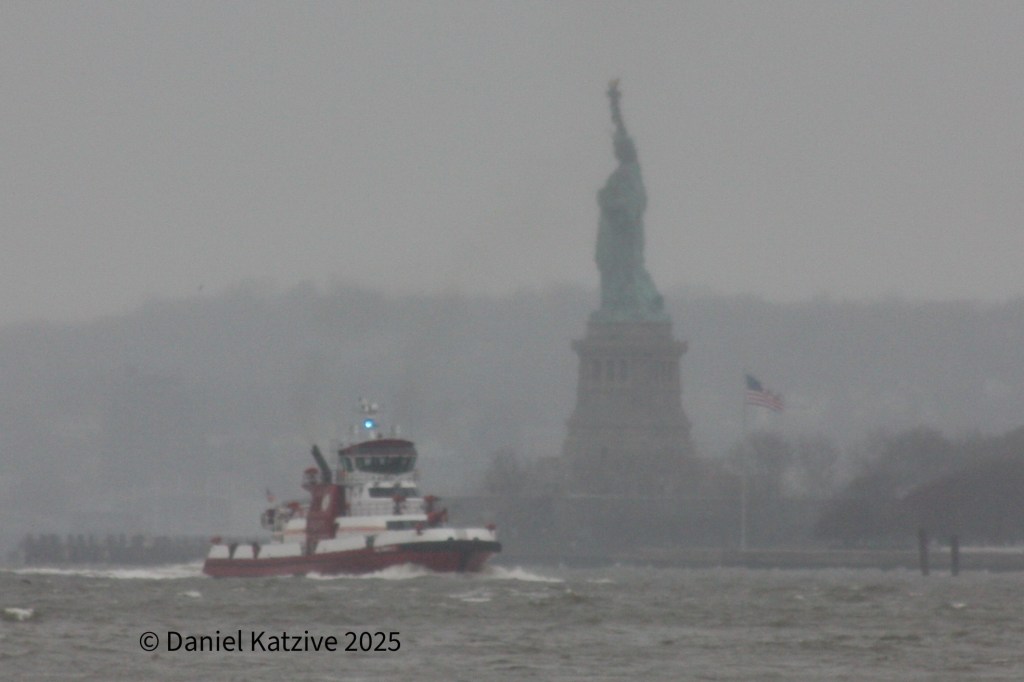 The FDNY, USCG, NYPD all responded, along with boats from the North Jersey Fireboat Task Force, including Edgewater’s boat which had been on the water all day training. FDNY’s Marine 1 company responded quickly from their Chelsea base with their small “alpha” boat and was on the scene by 3:23 p.m., but the large Firefighter II boat later also came up from Staten Island along with Marine 6 boats from Brooklyn. Army Corps of Engineers and NYS DEC police were also on the scene, including the Corp’s Drfitmaster with its large crane.