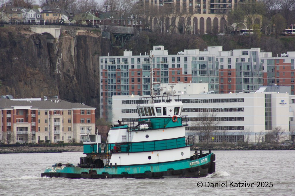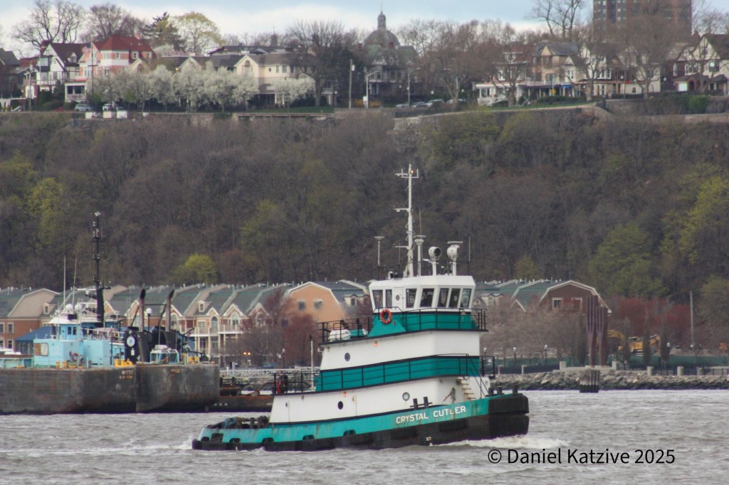 Crystal Cutler ran light up the North River Wednesday morning. She was paying a short visit to Marilyn George at anchor with her barge off Edgewater amid heavy winds, perhaps exchanging crew or delivering supplies. Crystal is the smallest of Poling-Cutler’s tugs with 1,500 HP vs. 4,200 for Marilyn and doesn’t really do Hudson River runs. I believe Crystal more typically works the terminals on the creeks and bays around New York Harbor, though she did pass through last month delivering a barge for service at the shipyard in Kingston.