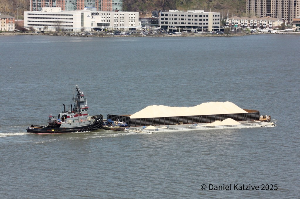 On Friday, Carver’s Mackenzie Rose passed up the North River headed for Port of Coeymans. In tow were two hoppers loaded with what I think was probably salt lightered off a bulk ship that was in the Upper Bay and had arrived from Egypt. A bit later, the 650-foot bulk ship Port Nagasaki came by, also headed for Coeymans and showing a port of origin in Chile and also likely laden with salt.