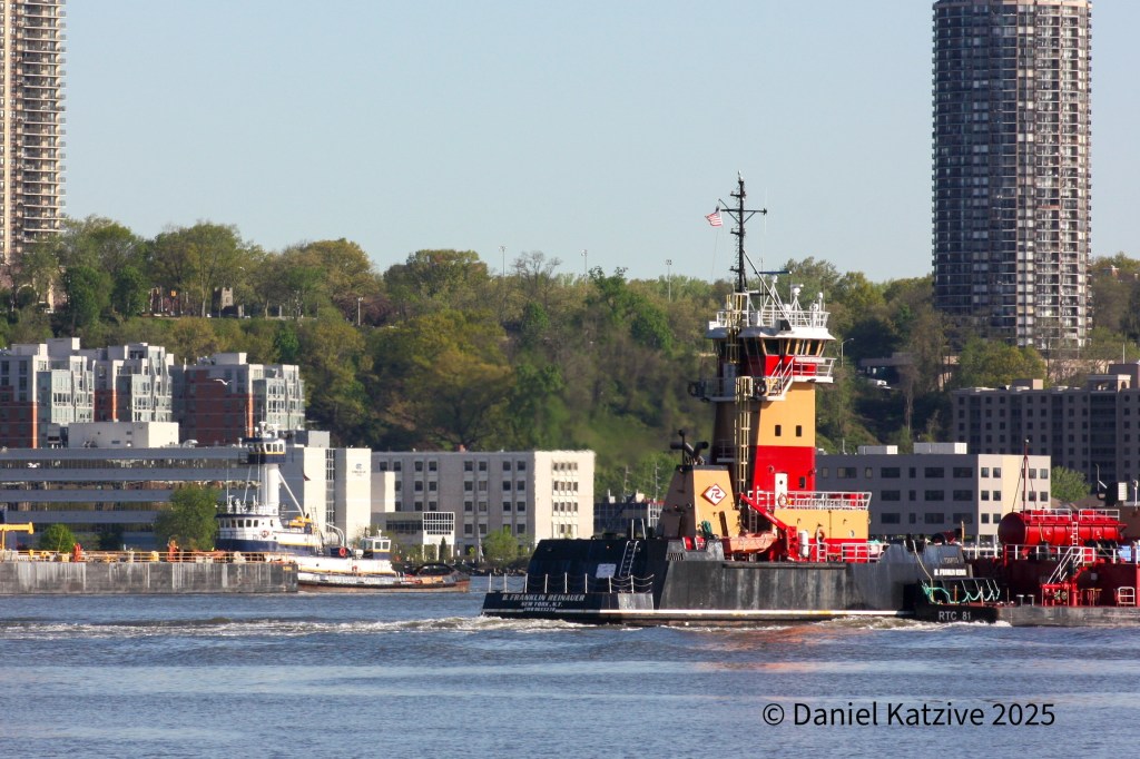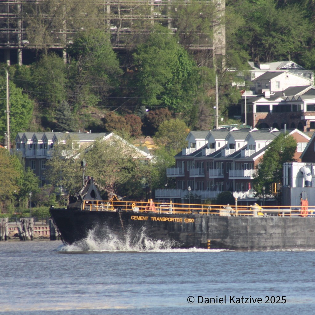 Cement passed fuel on the North River early Monday. Coral Coast had a cement transporter barge carrying product from the Ravenna, NY plant to a distribution terminal on College Point on Flushing Bay. Coral passed the B. Franklin Reinauer RTC 81 ATB loaded with an oil product cargo and heading for Albany (or perhaps Newburgh) on one whistle just off North Bergen.