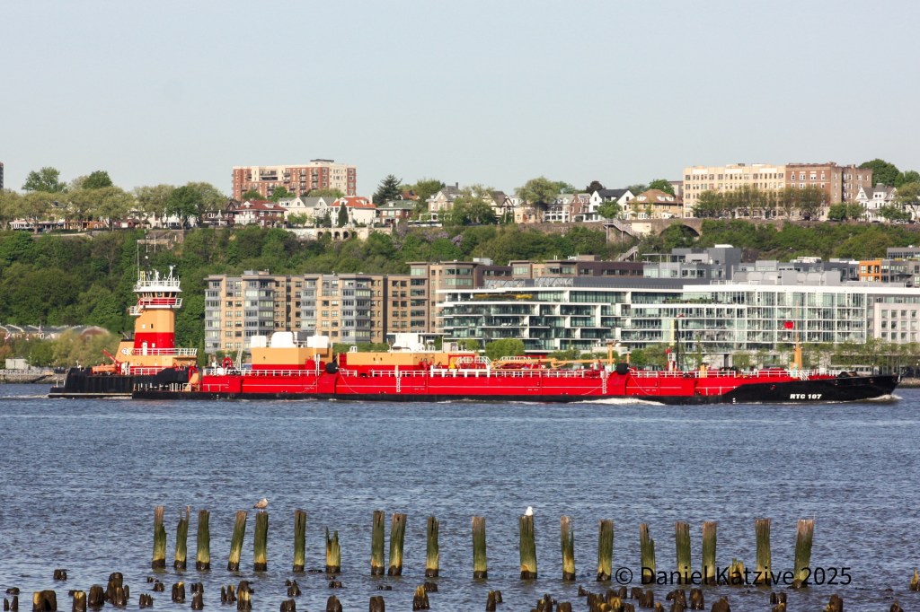Reinauer power was moving fuel up the North River on Thursday morning, with the big Haggerty Girls/RTC 107 ATB (4,000 HP tug, 413’ barge) and the Curtis Reinauer/RTC 80 ATB (4,000 HP tug, 347’ barge) passing by in quick succession heading for different terminals in Albany. They passed Lucy Reinauer anchored with a light barge about 3 miles south of the bridge after returning from Newburgh. Don’t know the exact cargos any of these barges carry at any given time, but with temperatures warming, gasoline and diesel are probably supplanting heating oil demand up north.