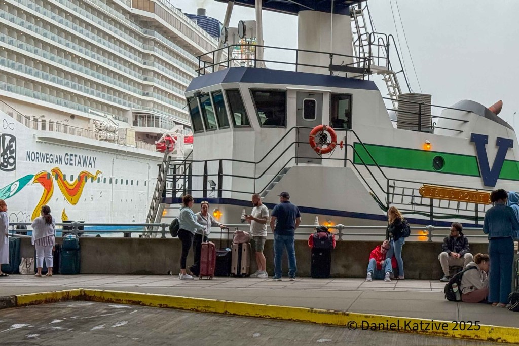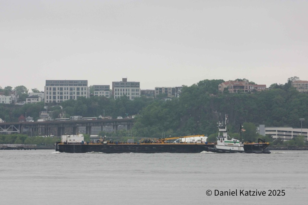 Vane Brothers tug Fells Point stood by near Pier 88 on Tuesday as Norwegian Getaway took on fuel from a barge alongside and disembarked passengers waited for transport. Getaway began its summer schedule last week making regular runs from NYC to Bermuda through mid-August after spending the winter visiting Mexico and Central America from New Orleans. Fells Point later departed with the barge on the hip, heading for the Vane barge docking area on the Brooklyn waterfront.