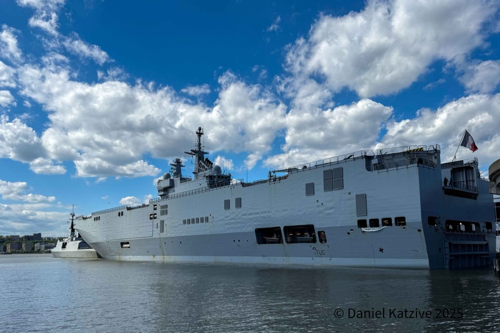 The French navy dropped in for a visit to NYC Wednesday, with the amphibious assault ship Mistral, one of three in the French fleet, and the frigate Surcouf tieing up on the south side of Pier 88. The ships are about half way through a five month training mission making a clockwise circuit around the North Atlantic. They previously called on New Orleans and conducted exercises with the US Navy off the coast of North Carolina.