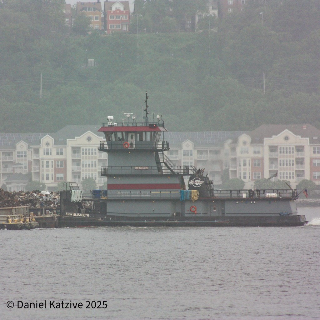 Carver towboat Erin Elizabeth cut through Friday morning fog with a load of scrap metal from up north. Erin was heading for the scrap dock in Newark where a Turkish-flagged bulk ship was loading metal for export probably back to Turkey. Perhaps the molecules will return to us one day as rebar or some other product. Skies were clearing Saturday morning when Erin passed the old Boat Basin Marina heading back home.