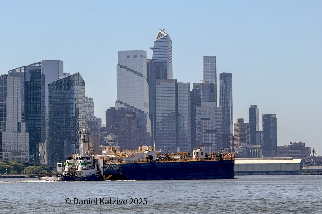 The Vane Brothers tug Patuxent was southbound on the North River with the light barge DS 601 on a very hot Tuesday morning. They were heading for the Vane base on Gowanus Bay after leaving anchorage off Riverdale.