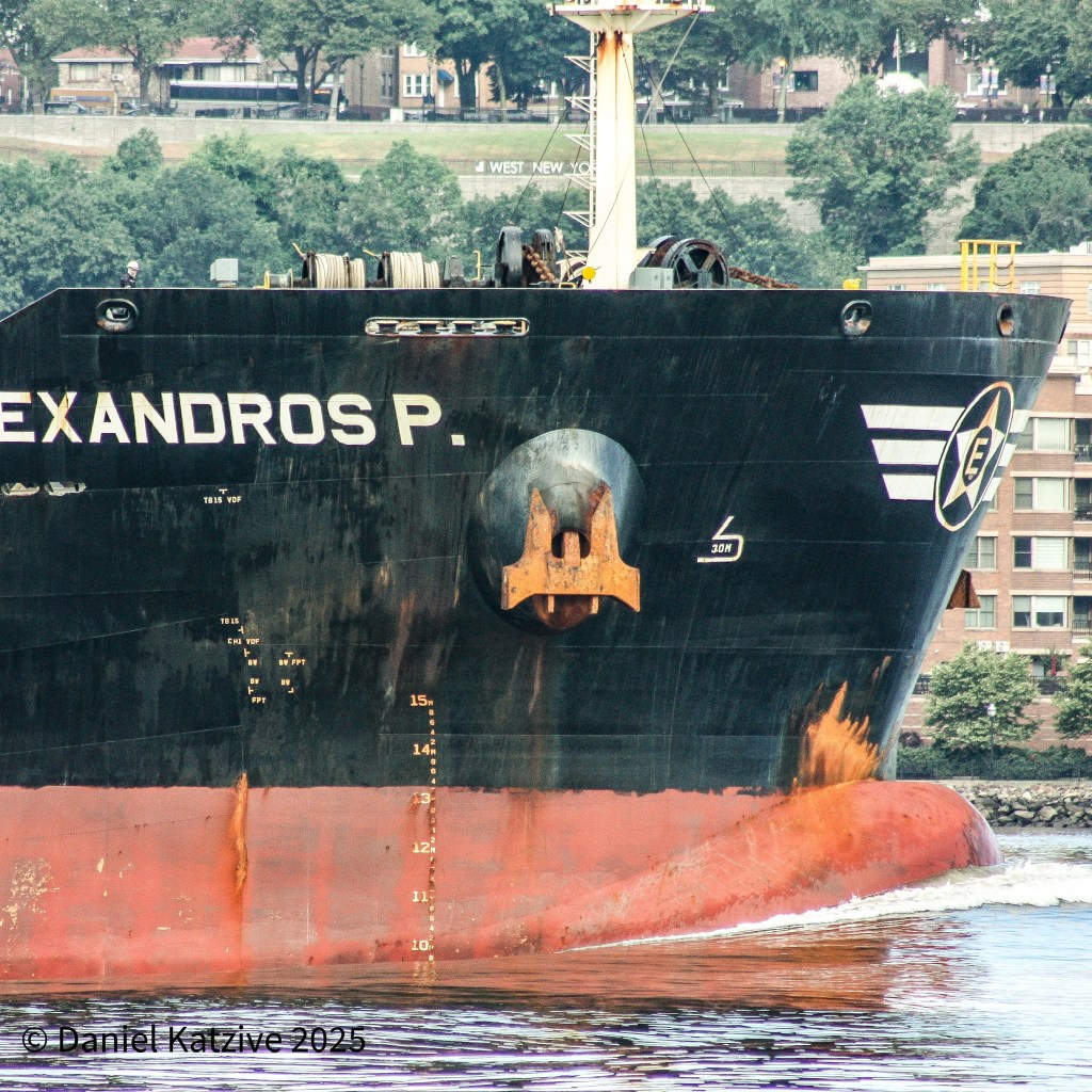 The North River was mirror flat in light northeast wind Tuesday morning and still flowing to sea just after low tide after Monday night’s massive thunderstorms and flooding. Alexandros P, a 656-foot Liberia-flagged bulk ship, came through heading for the Port of Coeymans. Alexandros originated in Garrucha, Spain, which makes gypsum a likely cargo, perhaps an ingredient for the Amrize cement plant next door to the port.